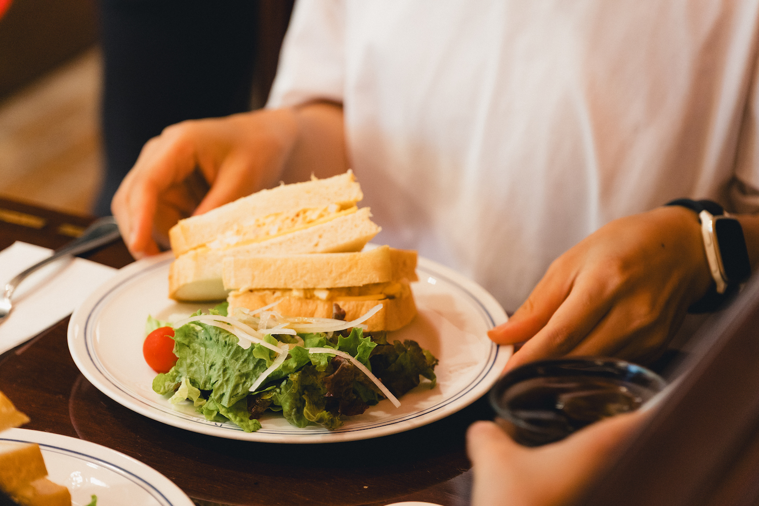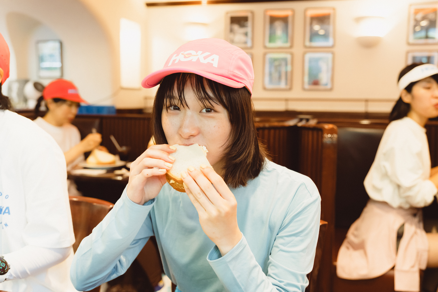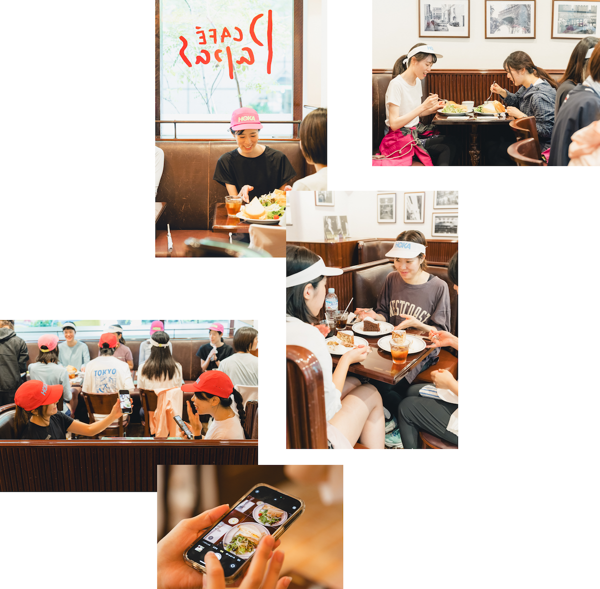 ゴール地点は〈ホカ 丸の内〉から近い〈PapasCAFE 丸の内本店〉。まるでヨーロッパのカフェのようなクラシカルな空間で、イベント限定のサンドイッチやケーキを囲みながら、優雅なカフェタイム。走り終えた達成感とともに、自然と会話も弾みます。