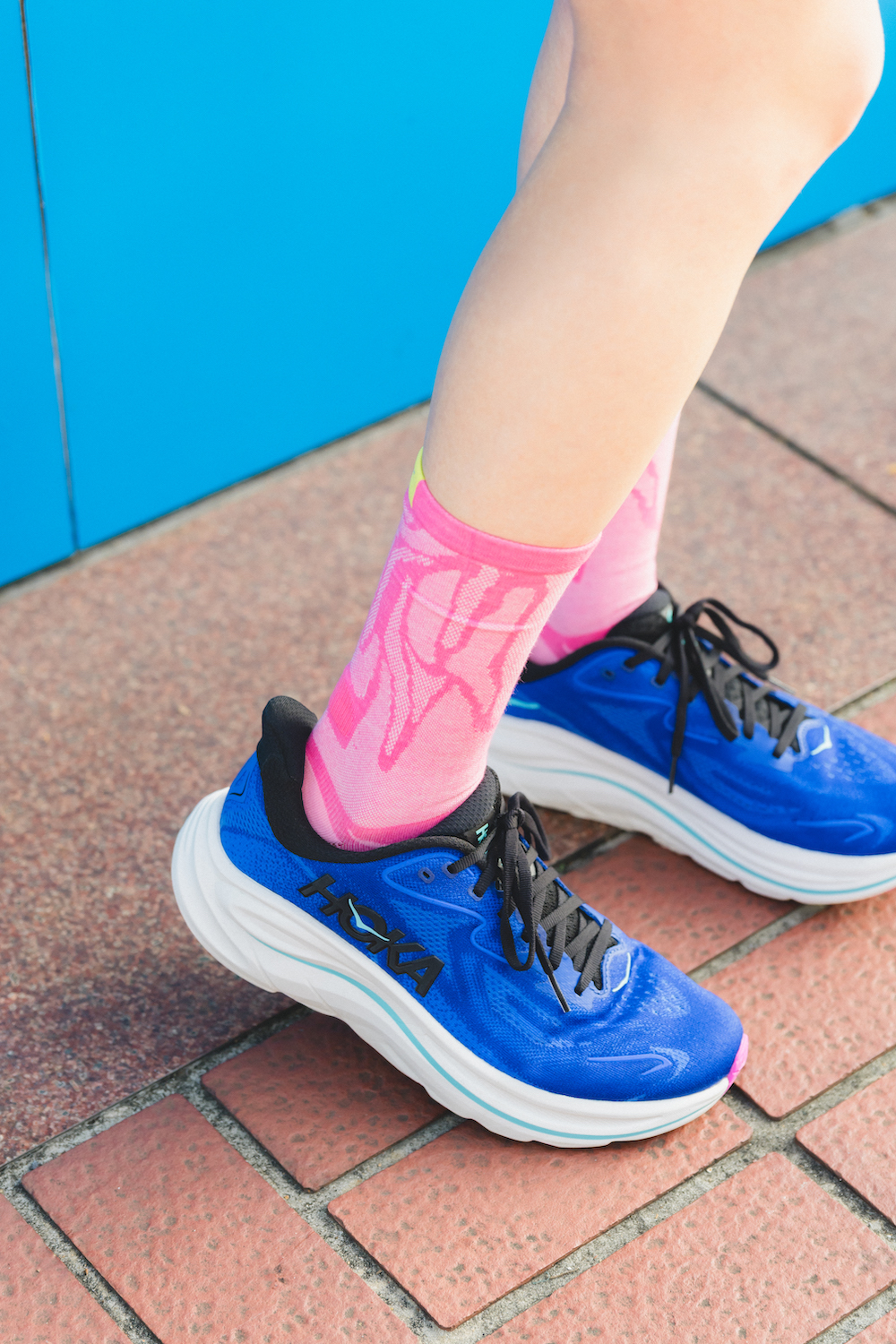 FUDGE.jp公式ブロガー、FUDGENA。FUDGEランニング部1回目からペーサーとしてジョイン。「わたしが履いているのはCLIFTON 10の新色。足の甲にぴたっとフィットして、とっても走りやすいお気に入りの一足です!今日はつま先のピンクとリンクさせて、鮮やかなピンクのソックスを差し色に。ソックス以外はブルーでスマートにまとめました」