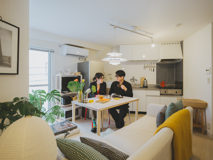 築約40年の1LDKマンションで2人暮らしをするEriさんとMintoさん。建築の仕事に携わる2人がこの住まいを選んだ理由は、その“変形平面”にあります。