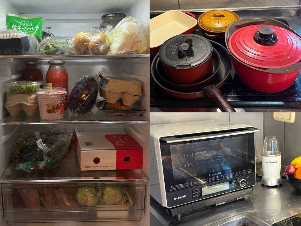 「いちばんのお気に入りはオーブンです。野菜や肉、魚を並べてスパイスをかけて放って置くだけで、ほぼノーオイルなのに美味しくて健康的な料理ができあがります。そういった料理は洗い物が少ないのも最高。《ティファール》の取っ手がとれるフライパンも愛用していますね。収まりがいいので収納がラクなんです。すべて赤色で揃えています」