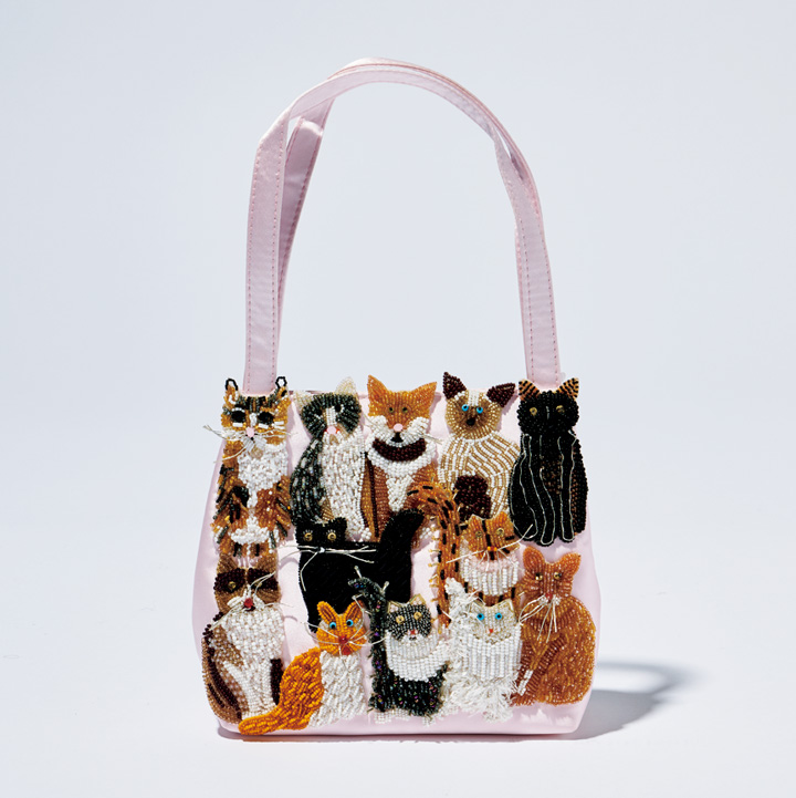 豊かな色彩とユーモアで人気の、ニューヨーク発《スーザン・アレクサンドラ》。ハンドメイドで仕上げたビーズバッグは、遊び心と上品さを兼ね備えた逸品。なかでも「ミャウミャウバッグ」は12 匹のネコさんが並ぶチャーミングなデザイン。サテン素材でパーティにもピッタリ。