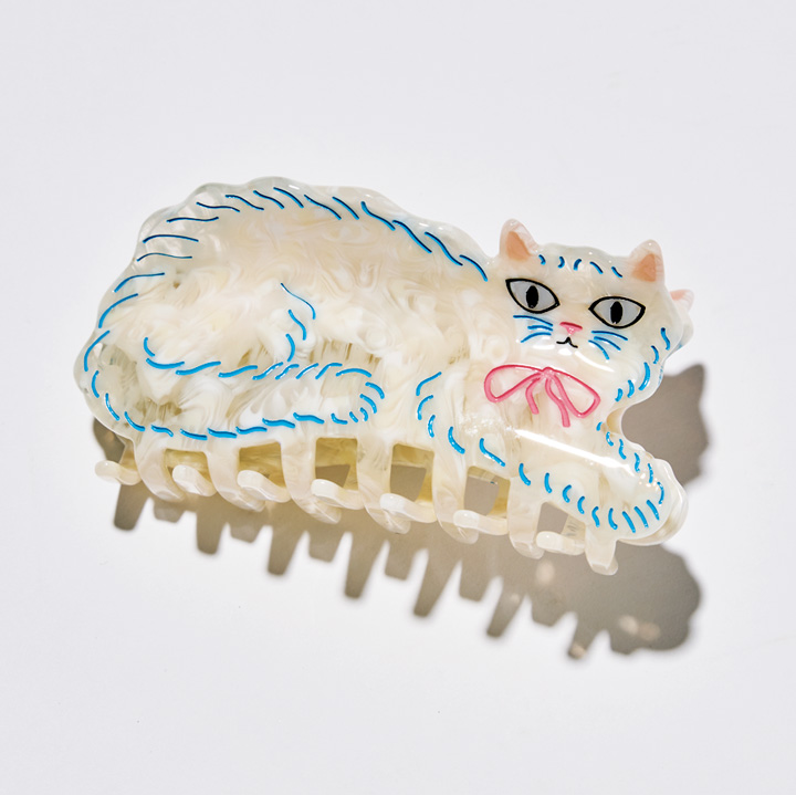 なくしがちなヘアクリップも、ネコモチーフならきっと大事にしたくなる。自然や動植物をテーマにしたアクセサリーを展開する、ロサンゼルスのブランド《ウィノナ アイリーン》。セルロースアセテートを手作業で彩色して仕上げるため、どれも少しずつ違う顔立ち。ペルシャ、三毛、黒ネコの3 種展開。