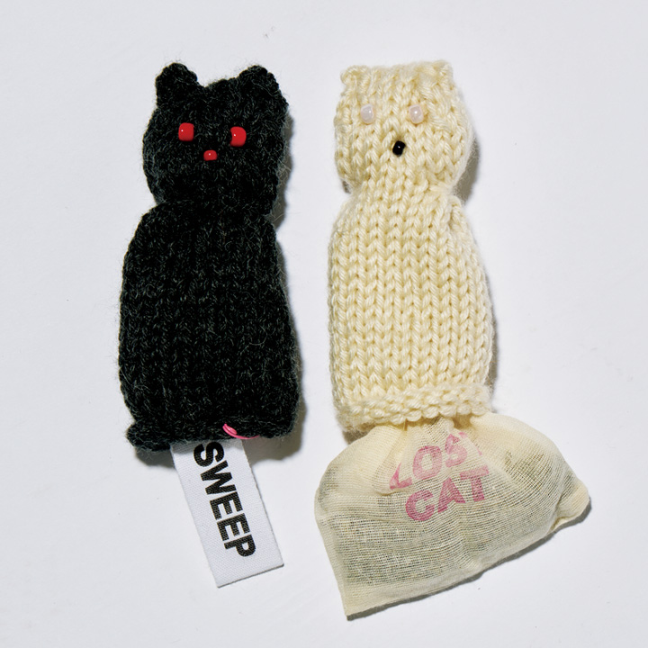 指人形サイズのネコさんは、ハンドニットで編まれた愛嬌たっぷりのサシェ。北海道富良野市のドライラベンダー入り巾着がセットで、防虫、防臭、安眠効果も期待できます、バッグやタンス、ピローケースに忍ばせるもよし、リップケースとしてもちょうどいいサイズ感。