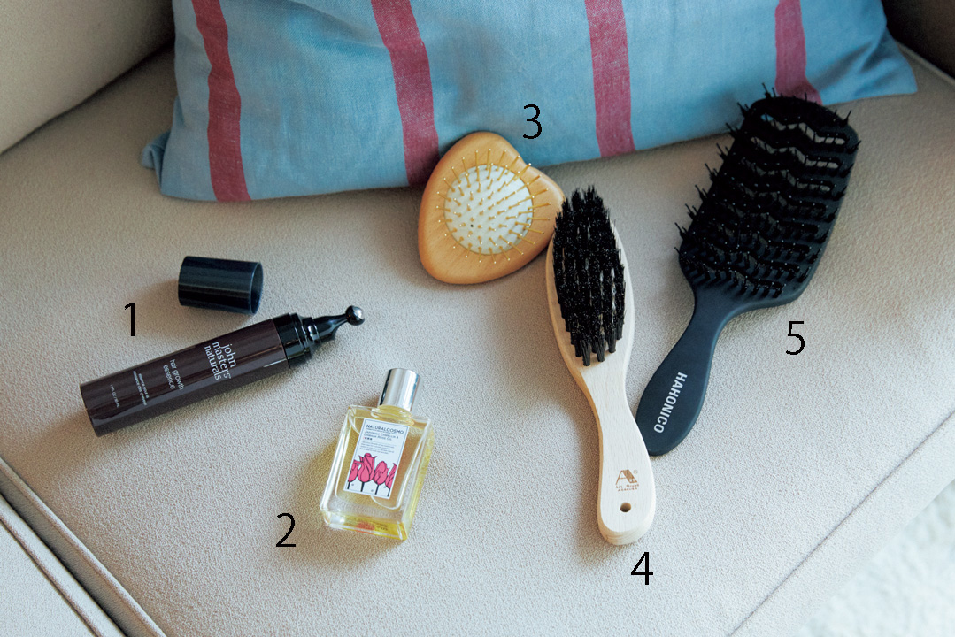 1.自然由来の3つの有効成分に加えて頭髪が育ちやすい環境に整える、リンゴ果汁とゴボウエキスを配合。真ん丸ヘッドがピンポイントで塗りやすい。薬用 ヘアグロースエッセンス ¥5940[医薬部外品]/John masters organics(ジョンマスターオーガニック) 2.佐賀県加唐島産と東京都利島産ののヤブツバキからコールドプレスで絞ったサラサラオイルをブレンドし、ブルガリア生まれのオーガニックダマスクローズオイルをIN。髪表面を保護してツヤをあたえ、パサパサ髪も程よくまとまる。メイク落としやリップオイルとしても。薔薇椿オイル 31㎖ ¥6050/NATURALCOSMO(三上) 3.ゴールドをブレンドしたチタン製のピンが、頭皮のツボを刺激しつつ筋肉のコリを解消。おでこや首、肩などのマッサージにも。プレミアム FOX カッサ ウッド ミニハートヘアブラシ ¥12100/SNOW FOX SKINCARE(スノー フォックス スキンケア) 4.髪を育てる獣毛代表・猪毛を使用したヘアブラシ。適度な油分が髪にツヤを与えるうえ、静電気も起きにくいのでこれからの季節にももってこい。ヘアブラシ・かみわざ ¥7110/Art Brush ASAKUSA(浅草アートブラシ) 5.シャンプー前のブラッシングに最適なスカルプブラシ。カーブした広い面が頭皮をしっかりとらえて髪をキャッチ。豚毛とナイロン毛のミックスで、とかすほどにツヤのある髪に。ハホニコ ホグレール ¥1760/HAHONICO(ハホニコ ハッピーライフ事業部)