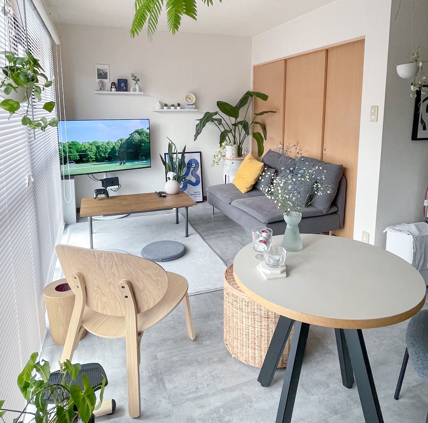 お部屋のシンボルツリーでもあるエバーフレッシュを中心に、どんどん増えているという植物に囲まれたリビングは、無機質なテイストに憧れつつもナチュラルな要素も取り入れた、リラックスできる空間。お気に入りの家具は、かなでもので購入されたというテーブル。本物の木でつくられた天板は、トップが白く側面には木目。素材感やデザインのバランスが気に入っているそう。