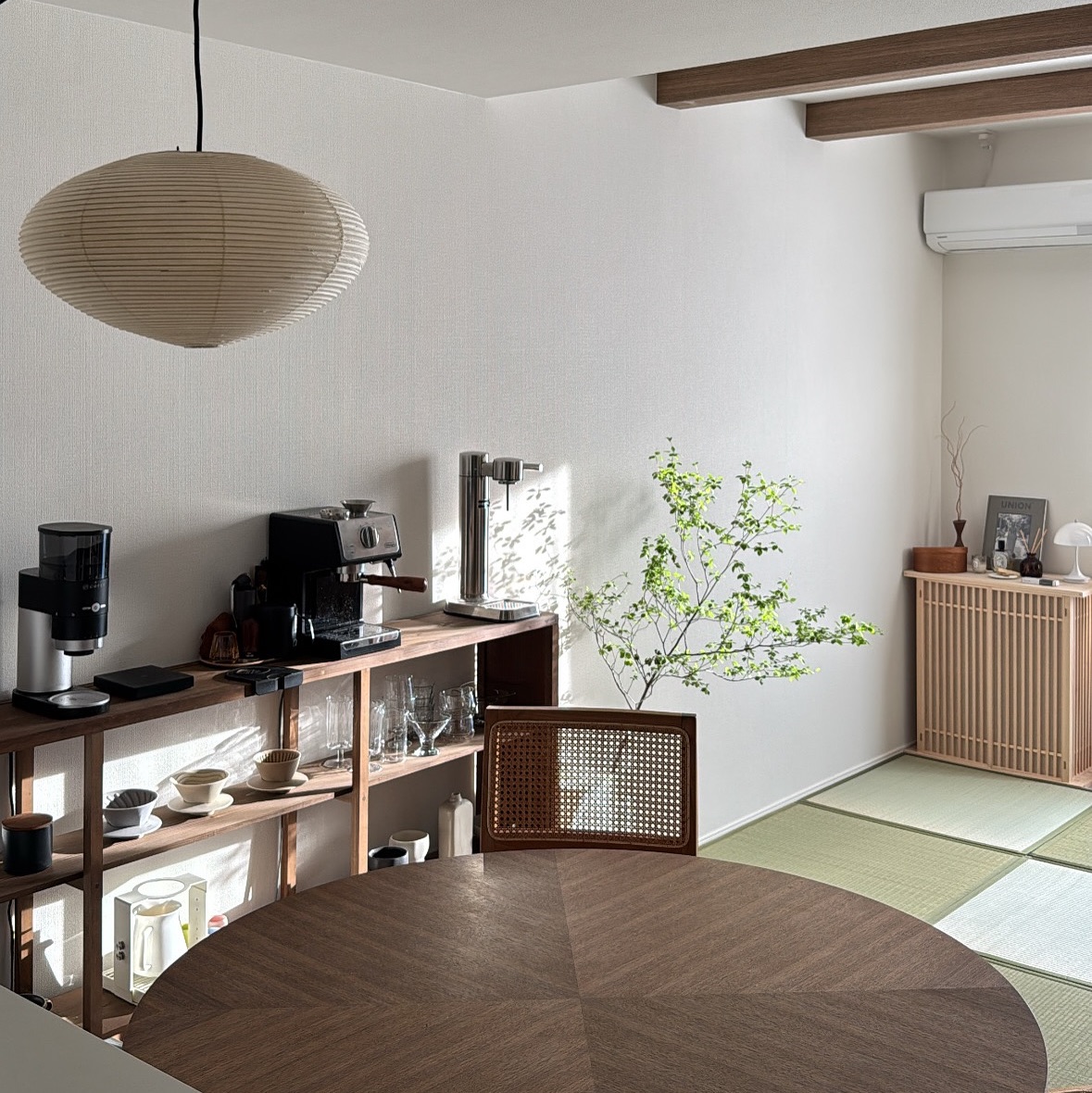 DIYでつくった家具や置き畳でジャパンディなテイストを取り入れつつ、オープンな棚に作家さんの器など好きなものを集めて。統一感のある整った空間でありつつ、こだわりやあたたかみの感じられる、素敵なお部屋でした。