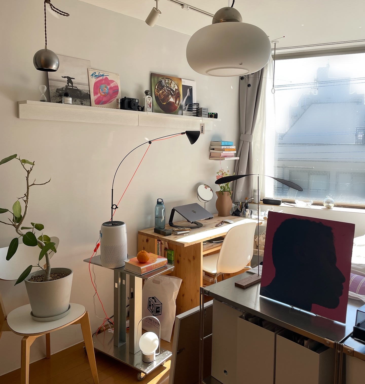 本が好きというhiyoさん。デスクは、オーダーして作ってもらったもので、本がたくさん収納できるようになっています。上に置かれているのはドイツの Midgard の照明。細く曲線を描くアームと鮮やかなカラーのコードが特徴です。1年前からInstagramをフォローするほど気に入っていて、引越したら絶対に取り入れようと思っていたアイテムなんだそう。