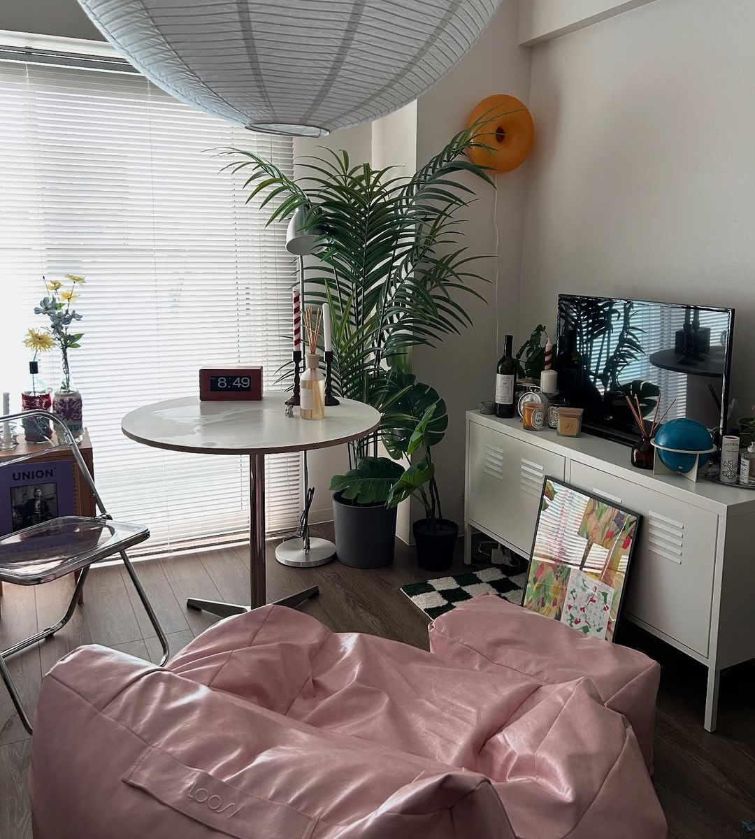 IKEAの大きなフェイクグリーンと、オレンジ色の間接照明を配置したコーナーは、部屋の中でも特に気に入っているスペース。Little Roomsで購入したピンクのソファ「LOOSY」は、身体を包み込むような座り心地がとても気持ち良いのだそう。