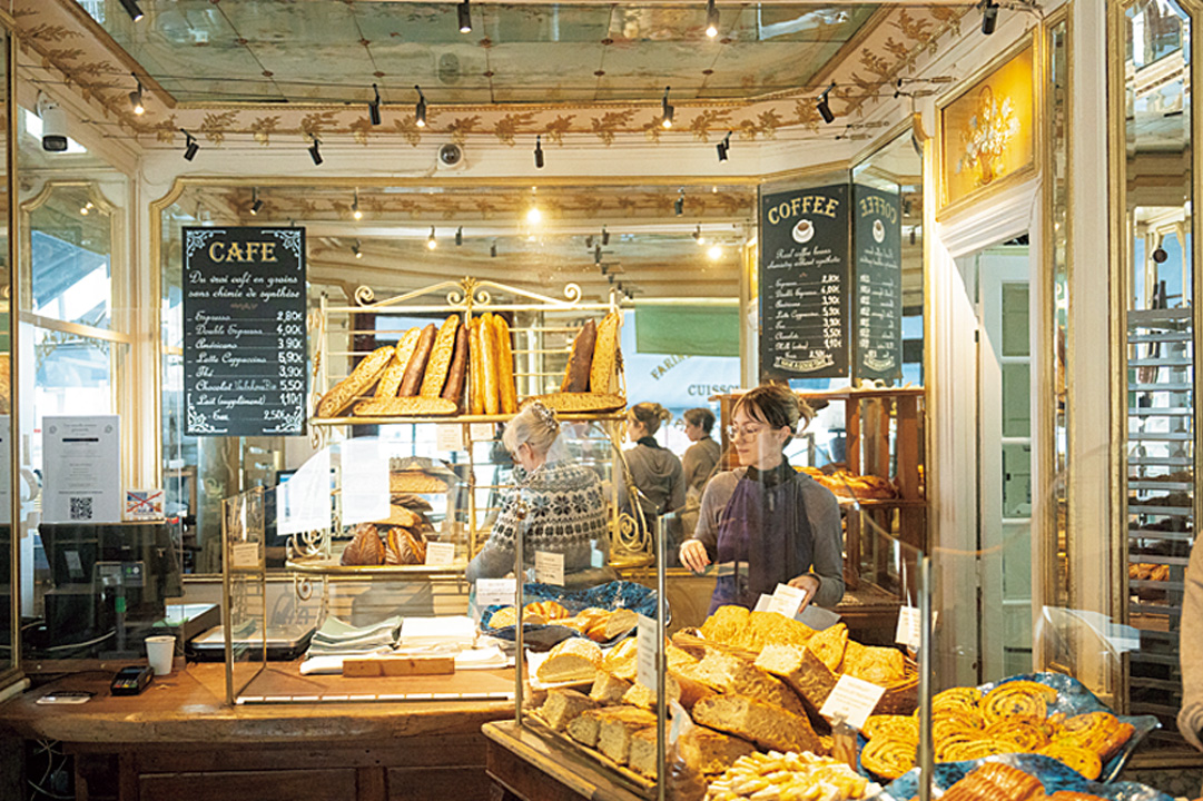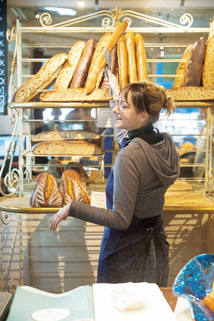 8 時間の勤務のうち、前半は行列の絶えないブーランジェリー〈L aTable par Du Pain et des Idées〉でレジ係、後半は隣のレストランでサーバーとして活動。お客さんの少ないタイミングを狙ってサクっと休憩を取る。