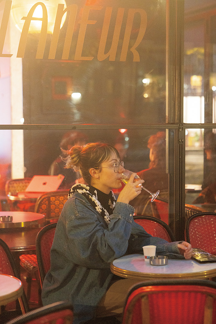 パリジェンヌには誰しも“いつものカフェ”がある。Mathildeにとってそれは、近所のカフェバー〈Le Flâneur〉。待ち合わせのアペロ仲間が来る前に、ロゼワインをひと口。