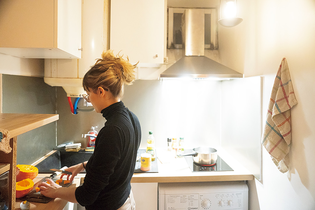 アペロ終わりに、サクッと自炊するのがいつもの流れ。寒い季節は、かぼちゃやキノコなどを使った、腹持ちのいいとろりとしたスープをよくつくる。料理と片付けは同時進行派。