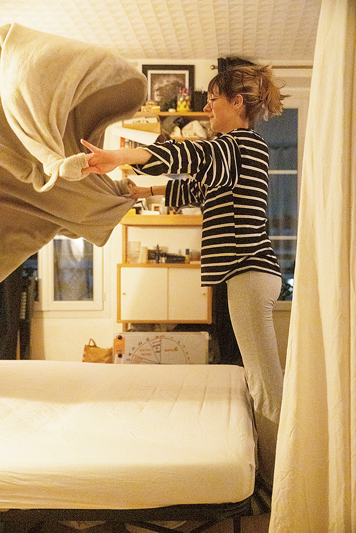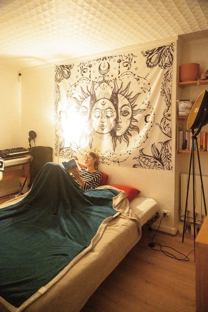 シャワーを浴びて、パジャマに着替えて、ソファをベッドに変形させたら、寝る準備OK。横になってNetflixでドラマを見たり、本の続きを読んだり。眠る直前まで、トレードマークであるビッグメガネは外さない。