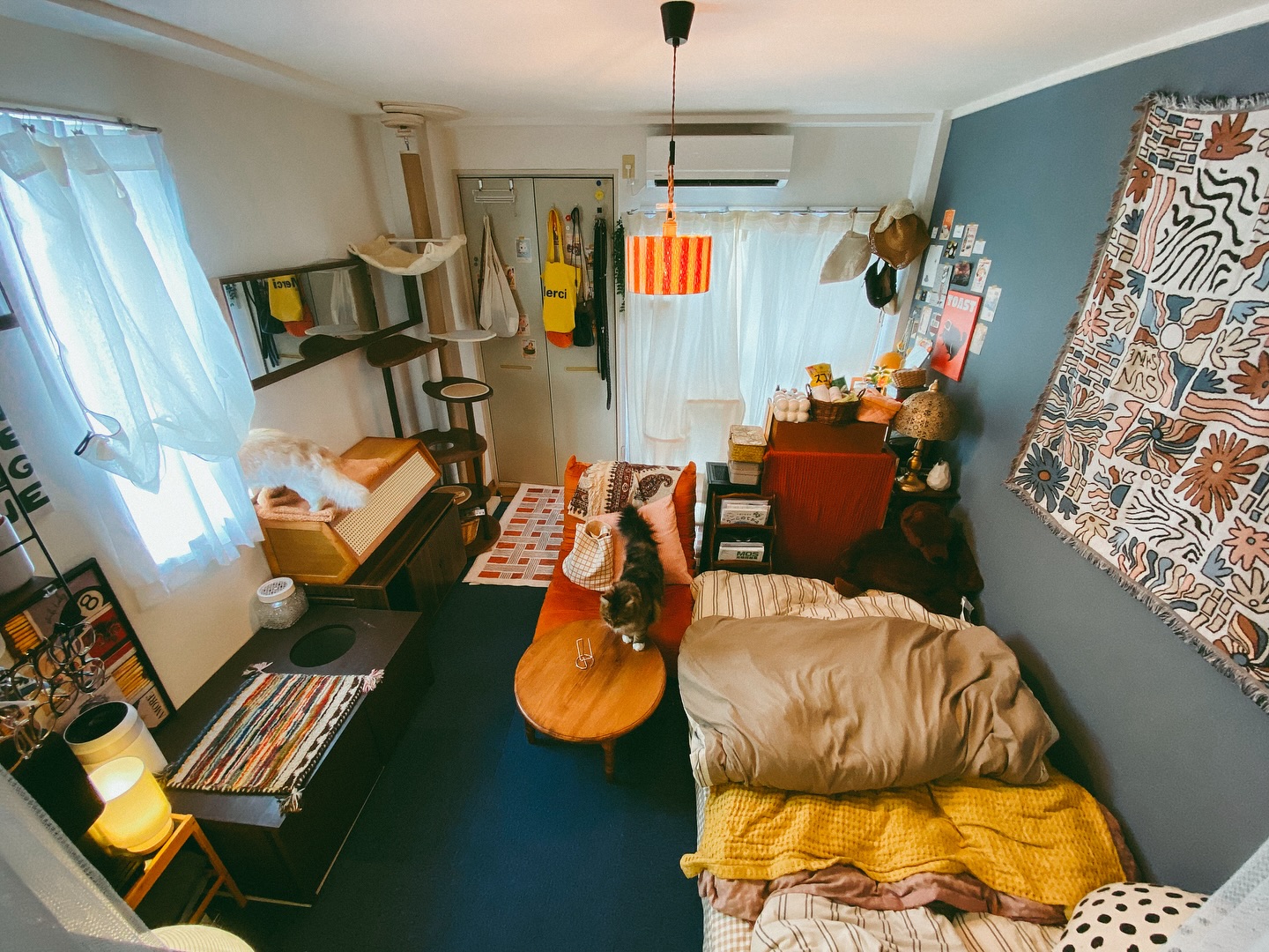 20㎡の小さな1Kに、好きなものを詰め込んで秘密基地のように。上手に収納スペースを確保し、色づかいの工夫で全体にまとまった雰囲気をつくられている、猫と暮らす一人暮らしのお部屋を拝見しました。