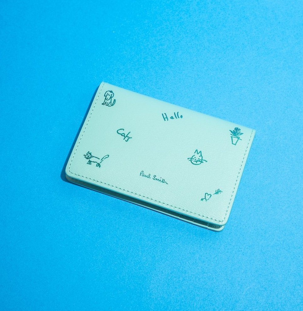 やさしいミントカラーの《ポール・スミス》のカードケース。上質なレザーに描かれた、ねこや犬、植木鉢のイラストが愛らしい。大人が持つからこそ可愛い、同ブランドらしいアイテム。