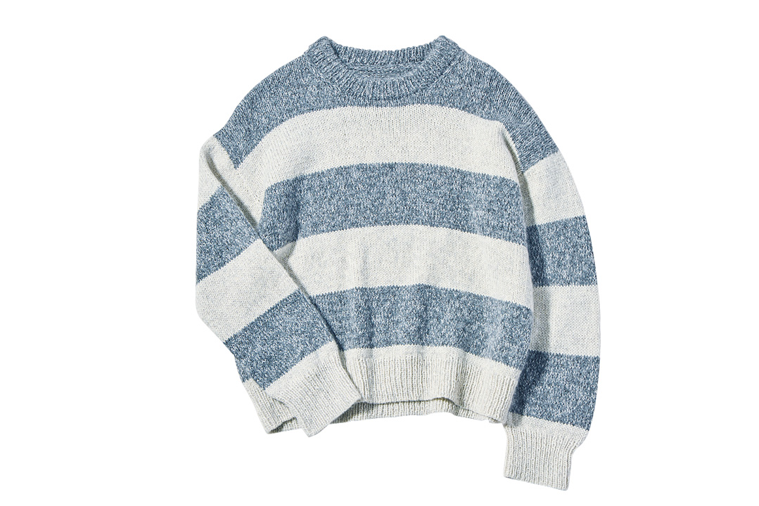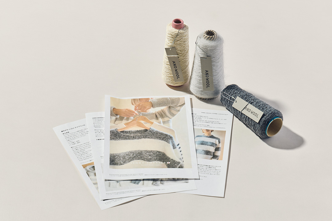 ニットを通して日常に彩りを添える《アンドウール》の糸で、ニットデザイナーのナガサワヒロミさんが手がけた「ジェナセーター」を編むキット。白と濃いグレーの毛糸はジャパンウールリネン、淡いグレーの毛糸はシルクモヘア。ボーダーのピッチは太くしたり、細くしたり、身頃と袖でピッチを変えて組み合わせたり、自分好みにアレンジ可能。これぞ手編みならではの楽しさ。