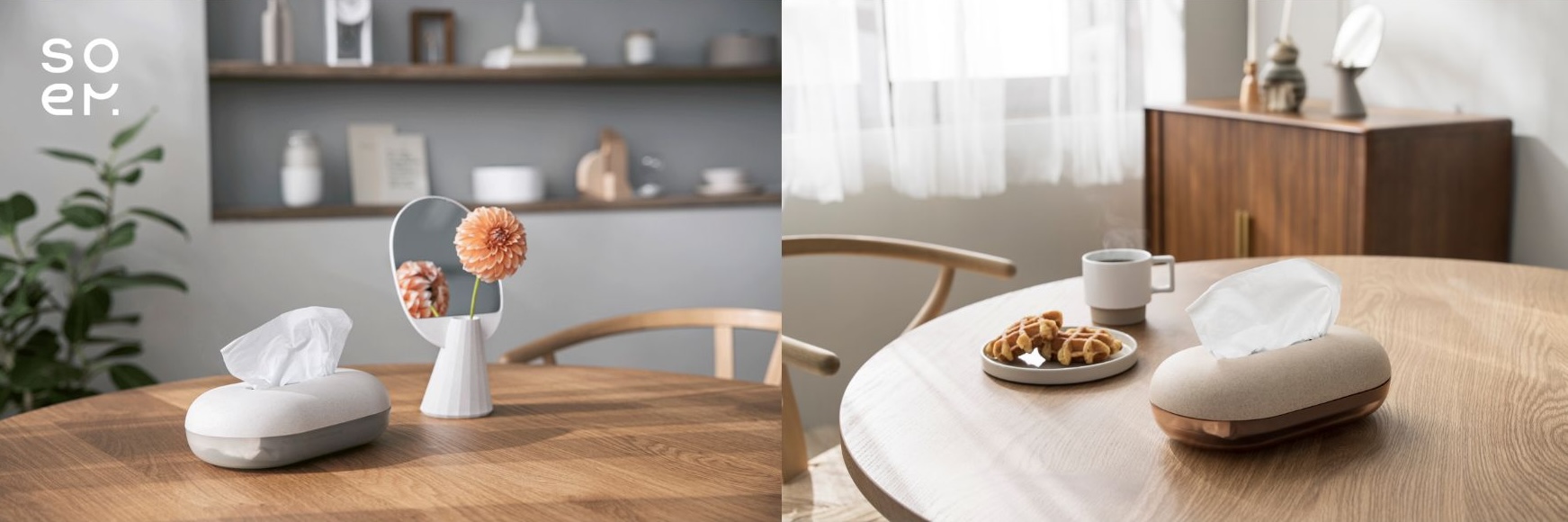 「消耗品ではなく、愛着を持って長く大切に使っていただけるプロダクトをご提案したい」という想いから始まったブランド。暮らしに寄り添いながらも存在感を醸し出せる素材感やカラー、ふと目に入った時に気持ちが明るくなるようなデザインにこだわっています。今回はさりげなく残量が見える、ツートンデザインのおしゃれなティッシュケースが登場。濡れても問題ない素材で、洗面所やキッチンでも使えます。