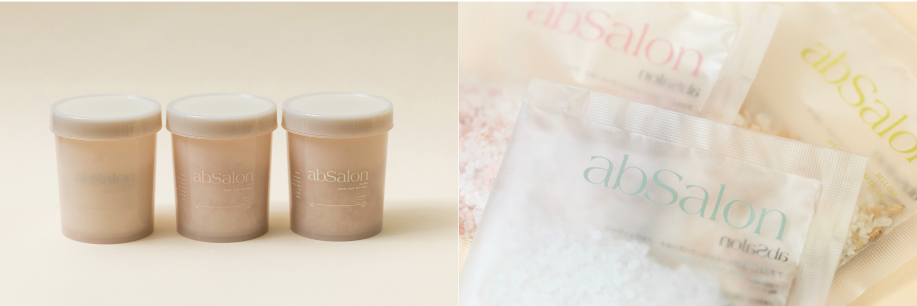 (左)SPRING SLEEP BATHSALT - BOTTLE – 400g 各¥6380、(右)abSalon spring sleep bathsalt trial set 40g(1回分)×3種の香りのセット ¥1980