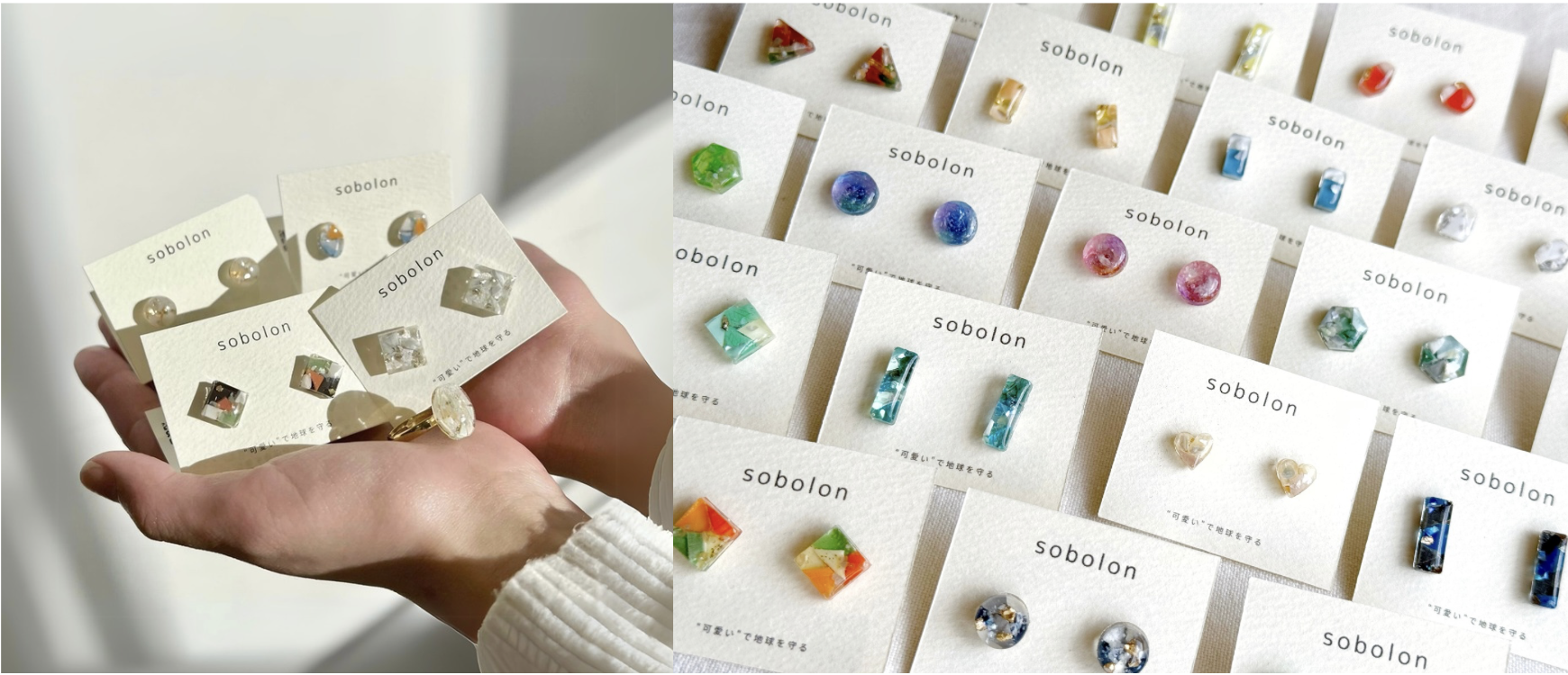 「”可愛い”で地球を守る」をテーマに、海洋プラスチックから、ときめきいっぱいのジュエリーを作っている《ソボロン》。日々にやさしく寄り添う、お守りのようなキュートなジュエリーが揃っています。ピアス、リング、ネックレスなど豊富なアイテム&豊富なカラーの中から、ビビッとくる1点を探してみて!
