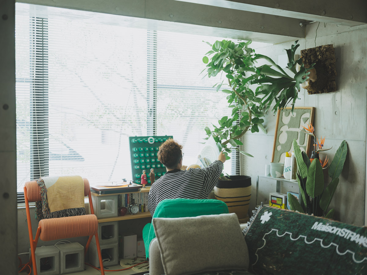 「ルールは『寄れば統一感、引けばカラフル』。一部分を切り取った時には、例えば緑のアイテムで固まっていたり、暖色系でまとまっていたり。でも部屋全体を引いて見た時には、それらが混ざり合って楽しい雰囲気に見えるように計算しています」