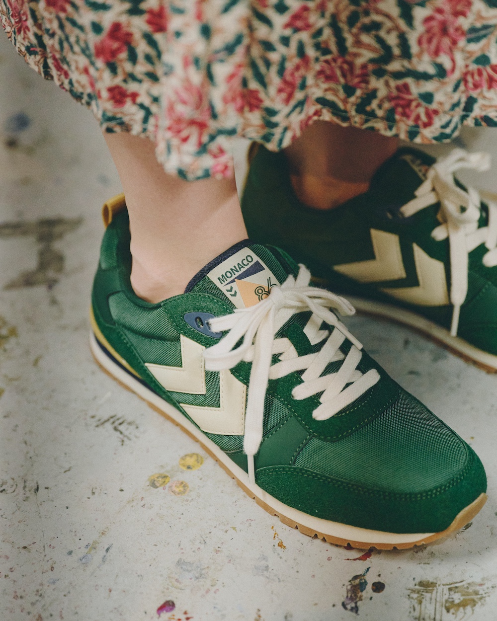 コンパクトな《ヒュンメル》のランニングシューズには、フレアな柄ワンピースが似合う。トップにボリュームがある分、足元をコンパクトにすると、こなれたバランスになるから。こっくりとしたグリーン×赤の配色に、1986年にデビューしたデザインとレトロな柄がしっくりとハマる。