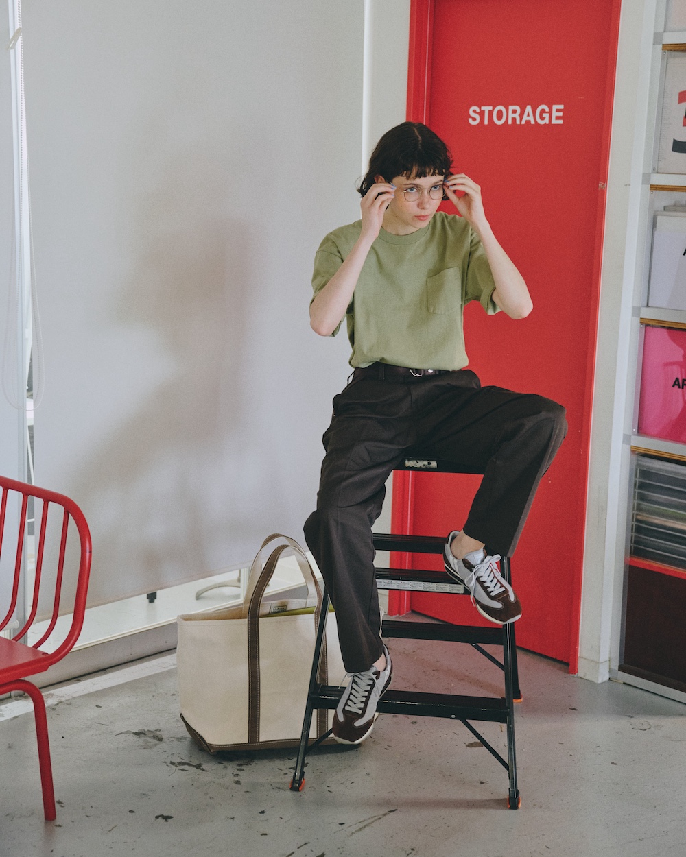 スニーカー¥16500/PATRICK(カメイ・プロアクト)、Tシャツ¥8800/ANATOMICA(アナトミカ 東京)、パンツ¥12100/RED KAP(ハイ!スタンダード)、メガネ¥46200/EYEVAN(アイヴァン 東京ギャラリー)、バッグ¥12100/L.L.Bean(エル・エル・ビーン カスタマーサービスセンター)