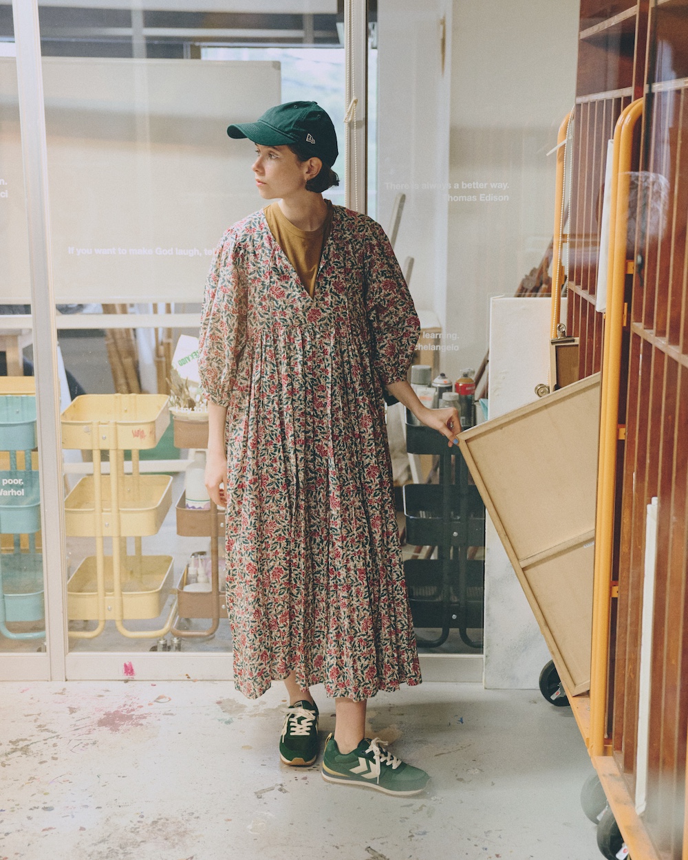 ▶︎持つならグリーンのスニーカー!レトロな柄ワンピースと相性良し【FUDGE dig.|バランス上手なあの子がお手本!ローテクスニーカーの着こなしレッスン- 06】