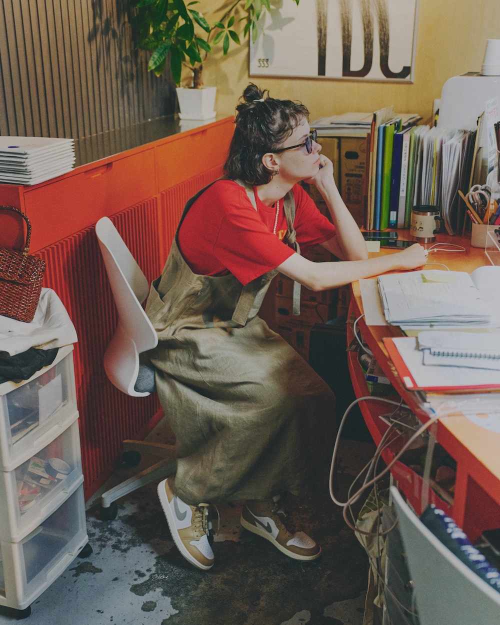 タイトめなジャンパースカートは、ミッドカットのスニーカーで足元にインパクトを持たせるとバランスが良い。Tシャツを重ねると子供っぽい雰囲気になるので、鮮やかな赤に落ち着いたベージュのコンビで大人に仕上げよう。ジャンパースカートとスニーカーの色を揃えたのも◎。さりげないパールのネックレスでこなれた着こなしに。