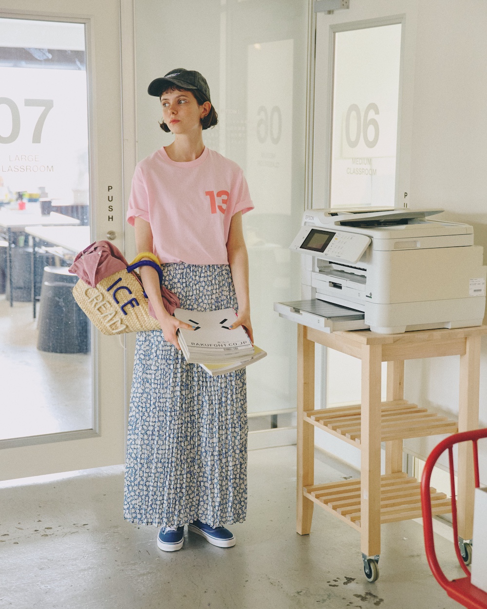 暑さが続くからこそ、涼しげなプリーツスカートの出番。存在感があるからこそ、シンプルイズベストな《VANS》のデッキシューズ”オーセンティック”が好相性。ブルーに統一したことで、落ち着いた雰囲気になり、その塩梅も◎。淡いトーンのピンク×ブルーなら合わせやすく、こなれた着こなしになる。