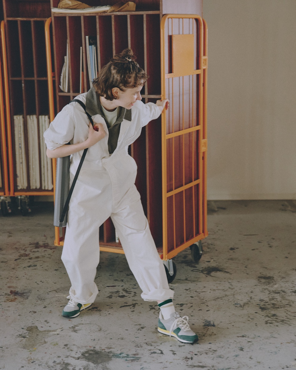 一枚でも着れて、袖を腰に巻けばボトム代わりにもなるジャンプスーツ。白ならきれいめになり、さらにポロシャツをインして洒落た着こなしにしよう。足元はクラシックなデザインに配色のバランスが東欧らしい《ノヴェスタ》のカラーシューズ。グリーンを差し色にして、ポロシャツと色味をリンクさせた小技を効かせたい。