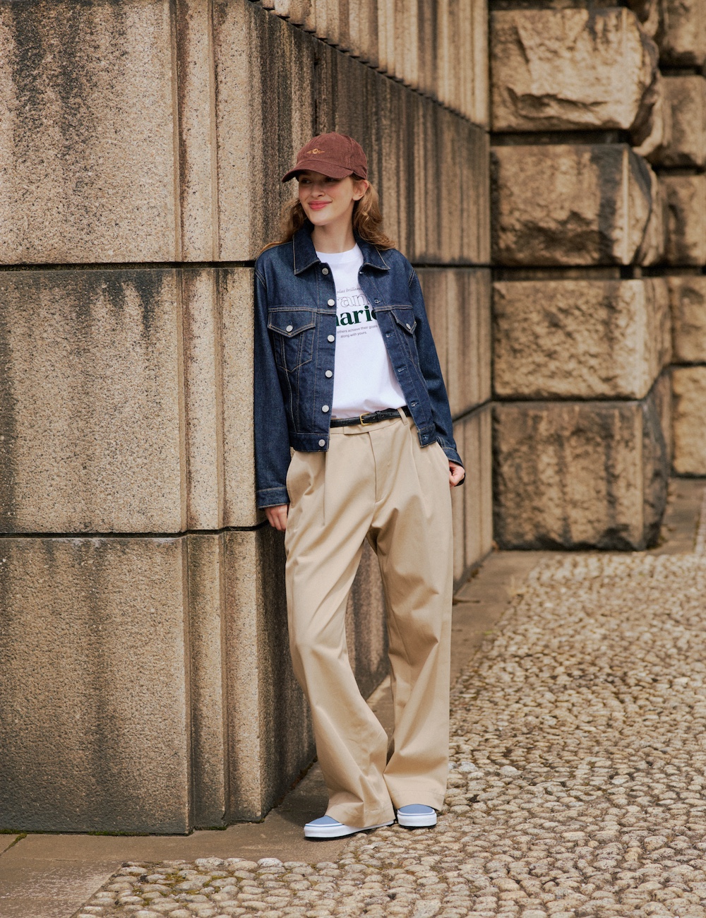 チノパンツをラフに、けれどきちんと穿きたいなら《Traditional Weatherwear》のユニオンスラックを選びたい。ワークウェアをきれいめにアレンジしたモデルなので、カジュアルなロンTも裾をINすれば、すっきりとした落ち着きのあるスタイルに。デニムジャケットは羽織るのはもちろん、今の時期なら腰巻きして、コーディネートに抑揚をつけてた着こなしのアレンジを加えてみても◎。