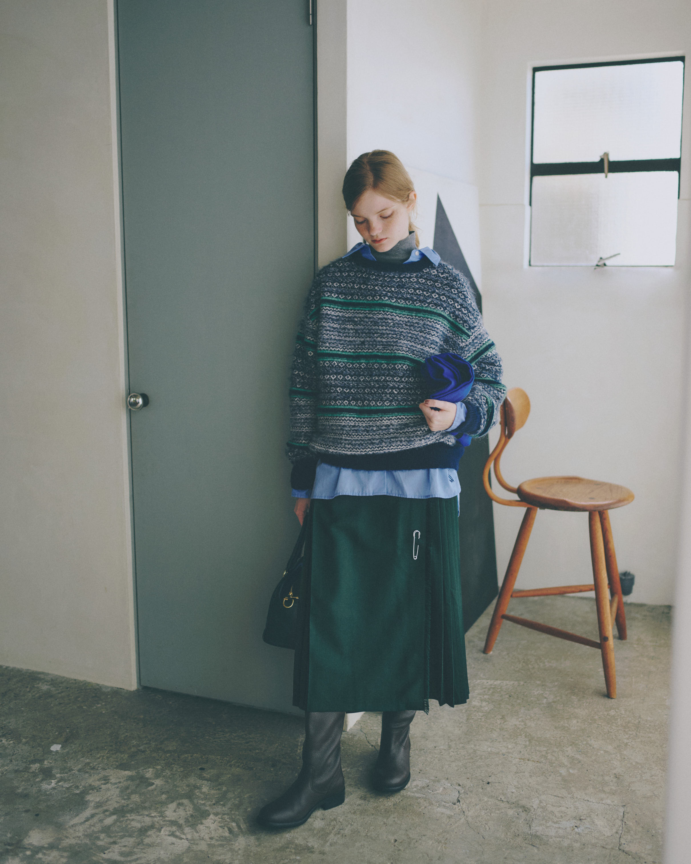 フェアアイルニットはスコットランドが発祥だからこそ、キルトスカートとの相性はもちろんお墨付き。それにシャツ+ニットのみだと、女学生風になりすぎてしまうけれど、タートルネックをひそませて、シャツの裾をチラッとだすだけで、こなれた着こなしに。仕上げにロングブーツでキリリとさせよう。