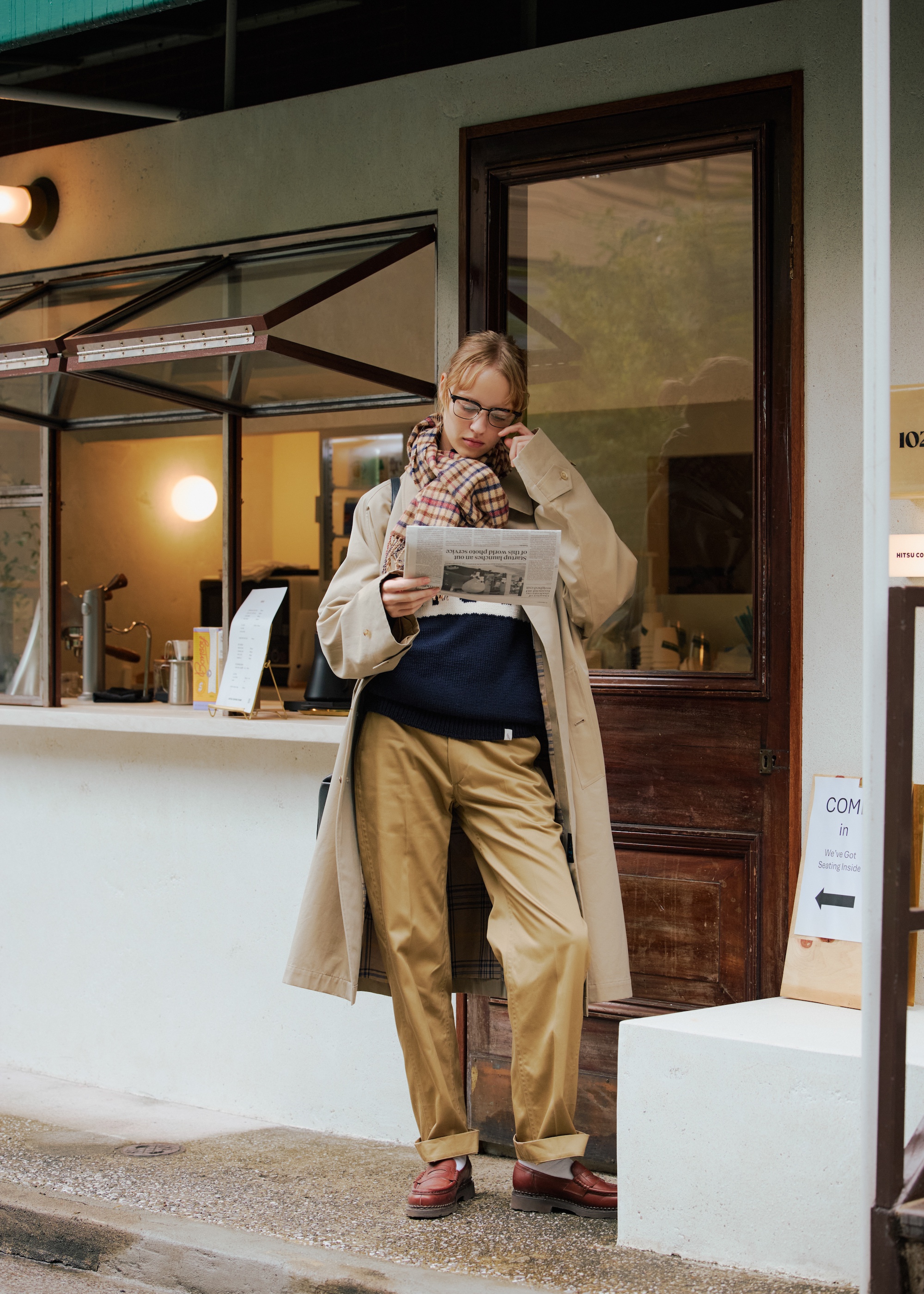 コート¥143000、パンツ¥35200 / ANATOMICA(アナトミカ 東京)、セーター¥34100 / PEREGRINE(真下商事)、メガネ¥84700 / Oliver Peoples(ルックスオティカジャパン カスタマーサービス)、マフラー¥8250 / L.L.Bean(エル・エル・ビーンカスタマーサービスセンター)、バッグ¥107800 / IL BISONTE(ルック D.C事業部)、ローファー¥94600 / Paraboot(パラブーツ青山店)、ソックス / スタイリスト私物