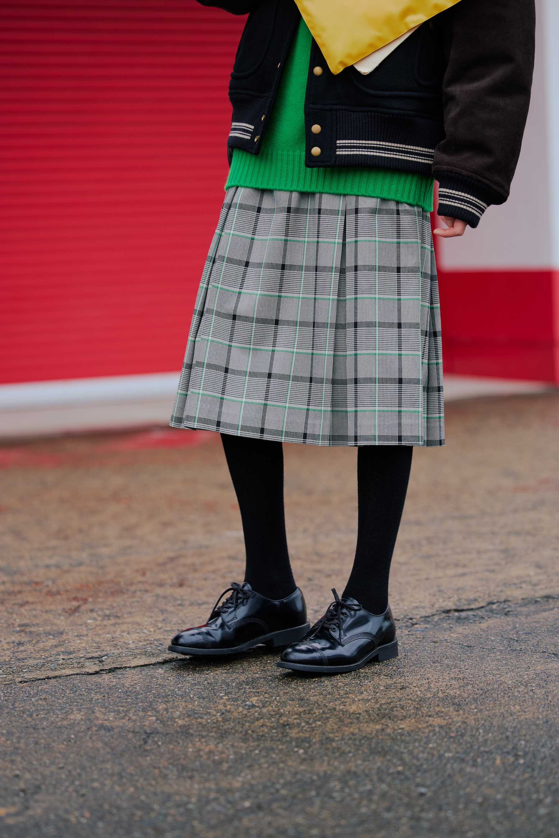 端正な印象のチェック柄に鮮やかなグリーンを織り交ぜ、どこかモダンなムードに仕上げた《SHIPS(シップス)》のスカート。ひざ下丈に加え、すとんときれいな落ち感が楽しめるボックスシルエットは、大人も取り入れやすいデザインです。アウターはスタジャンライクなブルゾンをセレクトして、スカートを引き立てて。知的さとカジュアルさの絶妙なバランスが、こなれ感を生み出す秘訣。