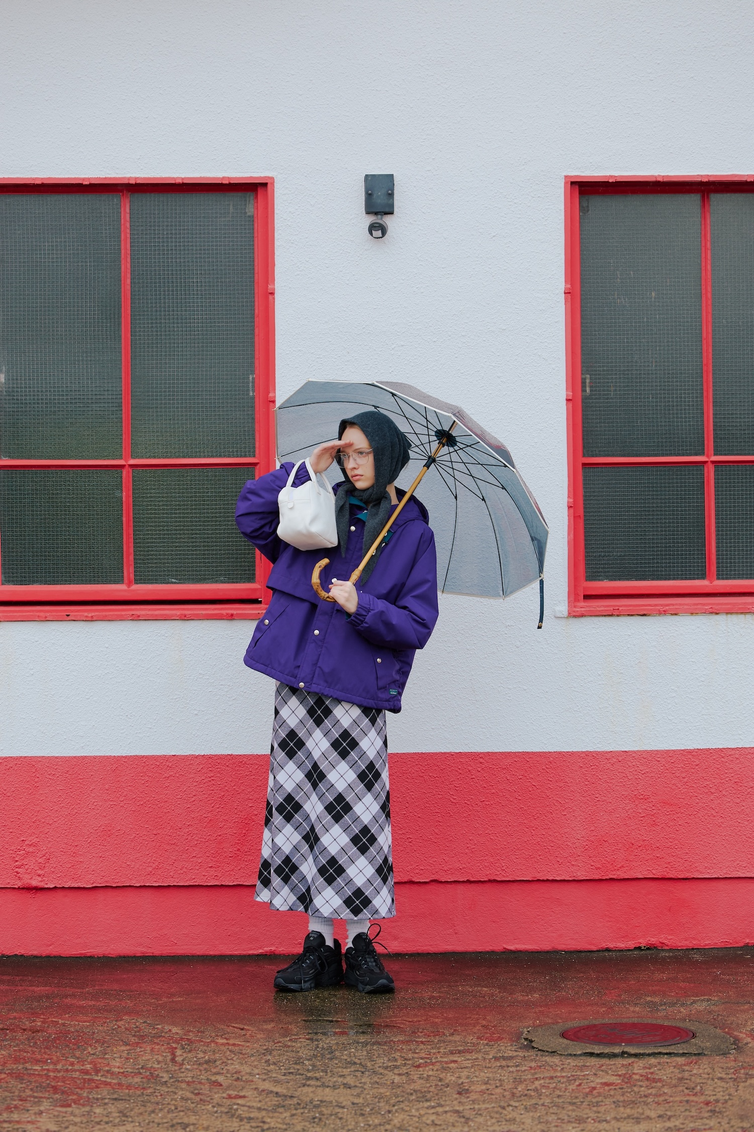 ジャケット¥42900/L.L.Bean Japan Edition(エル・エル・ビーンカスタマーサービスセンター)、三角巾¥14300/elegancese(ティータイム)、メガネ¥27280/Ray-Ban(ルックスオティカジャパン カスタマーサービス)、バッグ¥57200 ※2026年1月1日以降価格改定あり/IL BISONTE(ルック D.C事業部)、タイツ¥5500/MHL.(エムエイチエル.)、スニーカー¥19800/New Balance(ニューバランスジャパンお客様相談室)、その他/スタイリスト私物