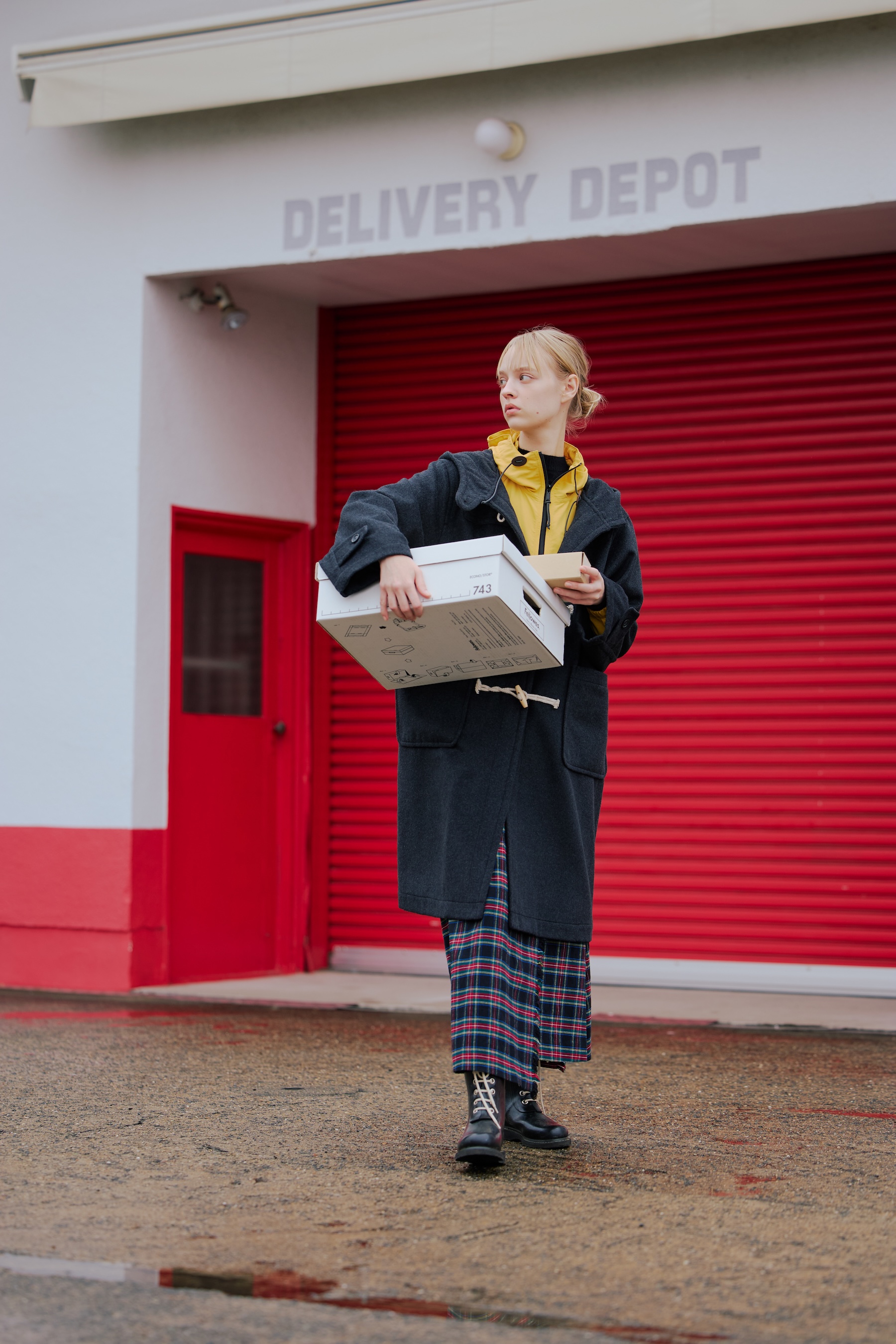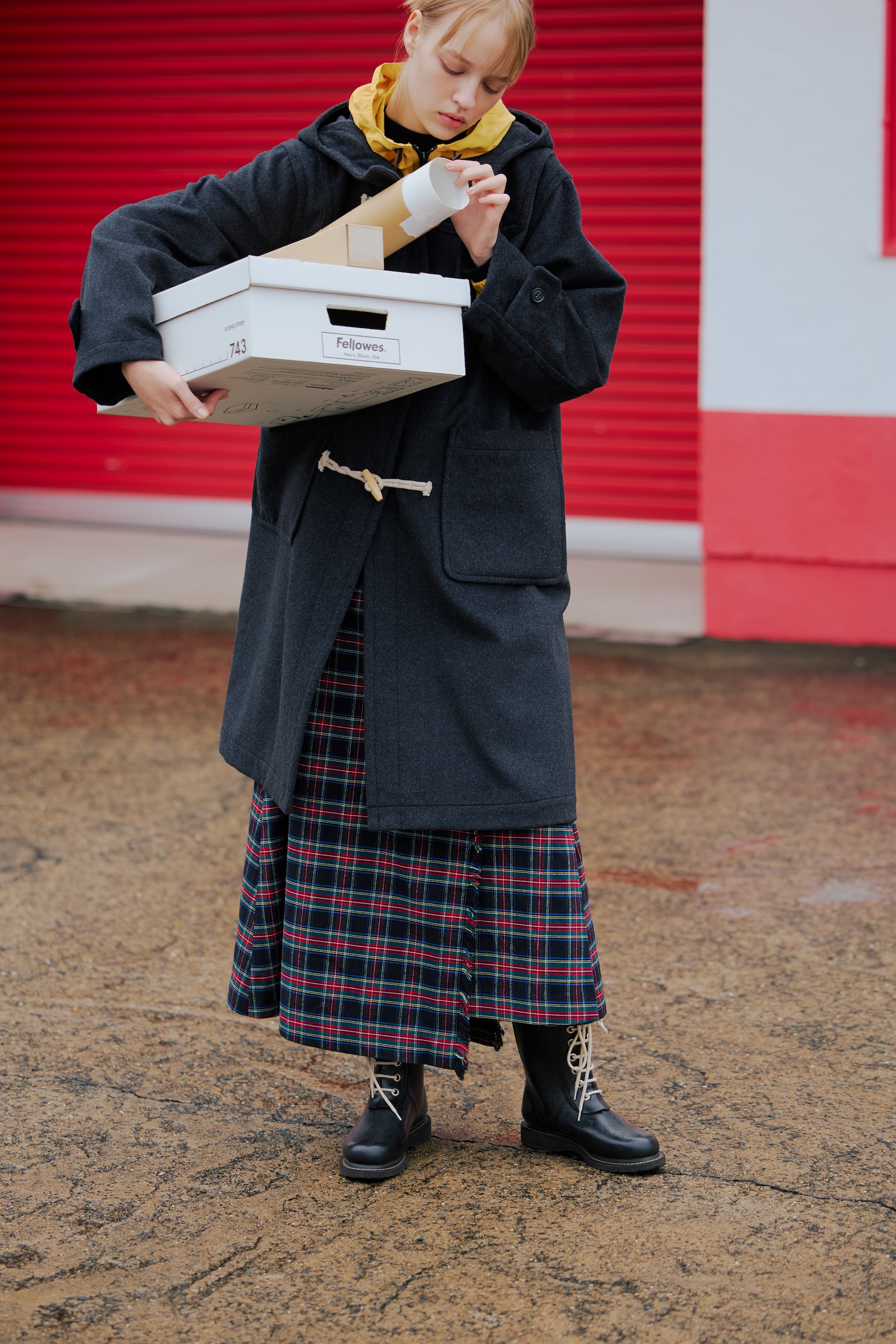 《L.L.Bean(エル・エル・ビーン)》のジャパンエディションコレクションのスカートは、日本の気候やトレンドに合わせて作られたもの。キルトスカートをベースとしたトラディショナルなデザインや、洗濯可能な起毛フランネル素材を採用した、機能性の高さが魅力的。ふんわりとあたたかみのあるロングスカートに合わせたのは、アノラックパーカと存在感のあるブーツ。正反対なアイテム同士ながら、不思議とマッチする。ダッフルコートを羽織ったら、アクティブ感を内包したトラッドスタイルが完成。