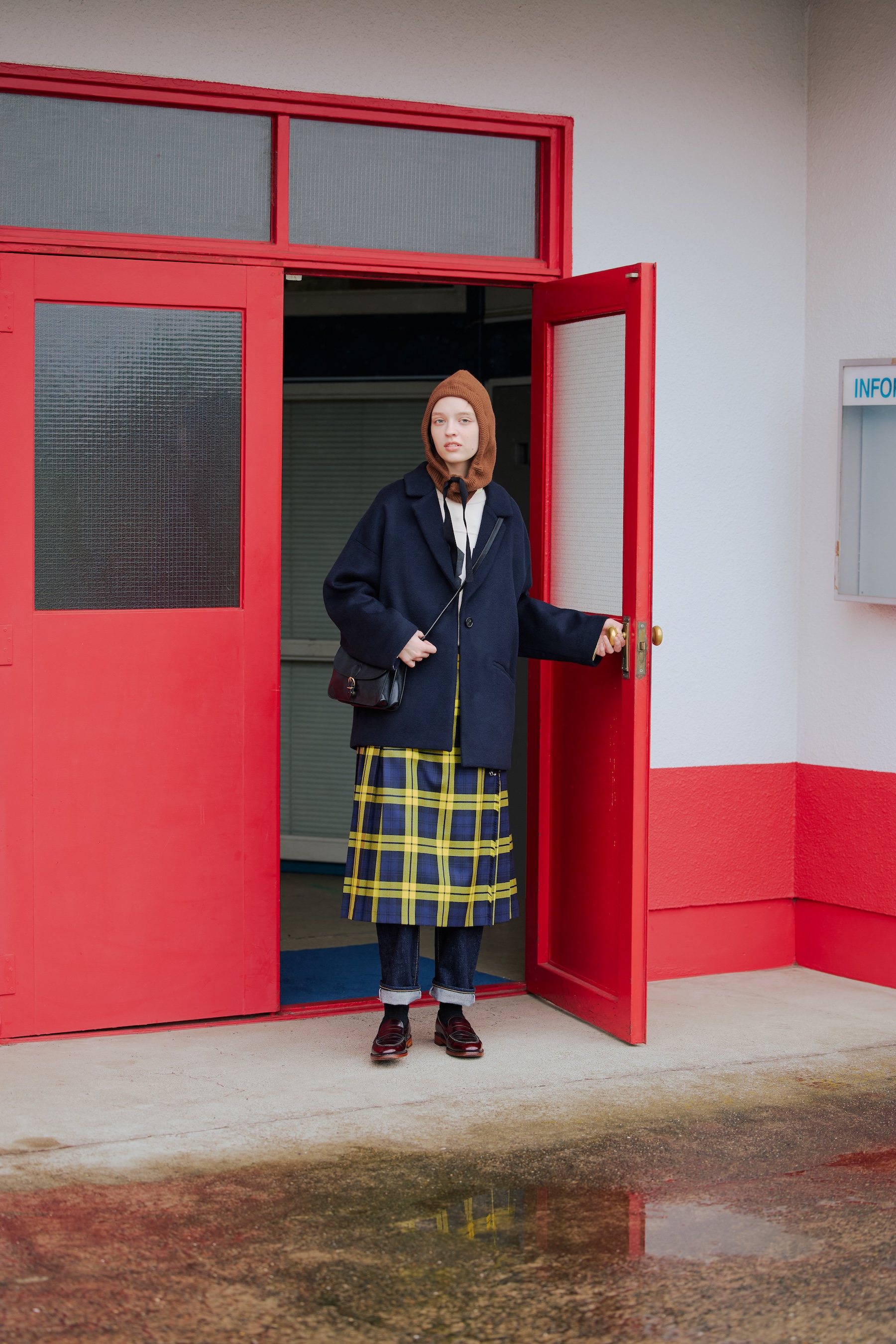 コート¥64900/TICCA(ティッカ)、ロンT¥14300/81 BRANCA × SHIPS(シップス インフォメーションセンター)、バラクラバ¥18700/MHL.(エムエイチエル.)、バッグ¥68200 ※2026年1月1日以降価格改定あり/IL BISONTE(ルック D.C事業部)、デニムパンツ¥37400/ANATOMICA(アナトミカ 東京)、ソックス¥4180/PANTHERELLA(真下商事)、ローファー¥42900/REGAL(リーガルコーポレーション)