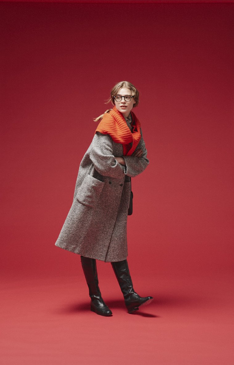 コート¥74250 / Jane Marple Dans Le Salon(セント・メアリー・ミード)、首元に巻いたスカーフ¥4950 / AULENTTI(セムインターナショナル)、オレンジの三角スカーフ¥13000 / BANANA REPUBLIC(バナナ・リパブリック)、ネックレス¥69300 / MARIHA(マリハ)、バッグ¥74800 / IL BISONTE(ルック D.C事業部)、タイツ¥1320 / 靴下屋(タビオ)、ブーツ¥99000 / KATIM(カチム)