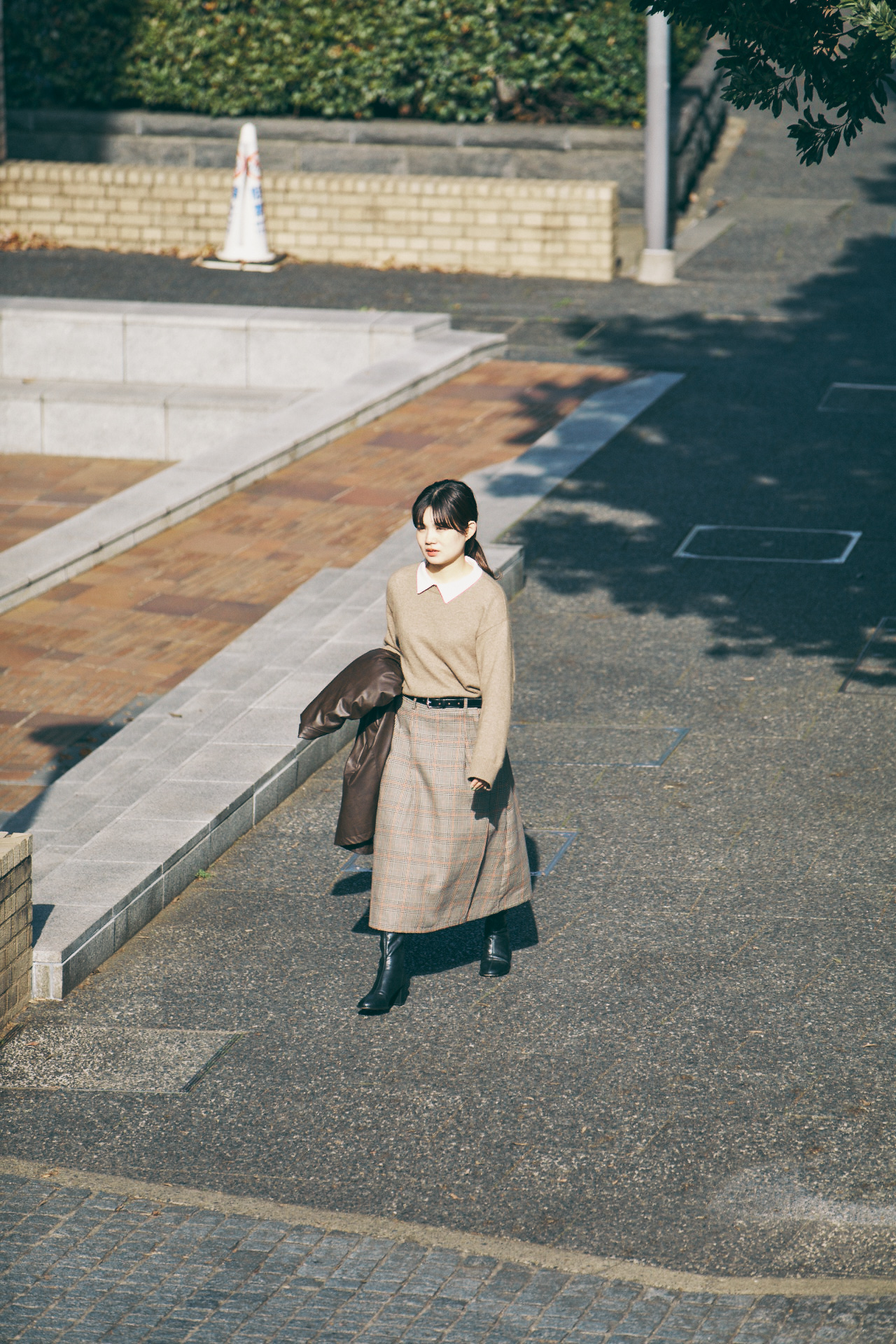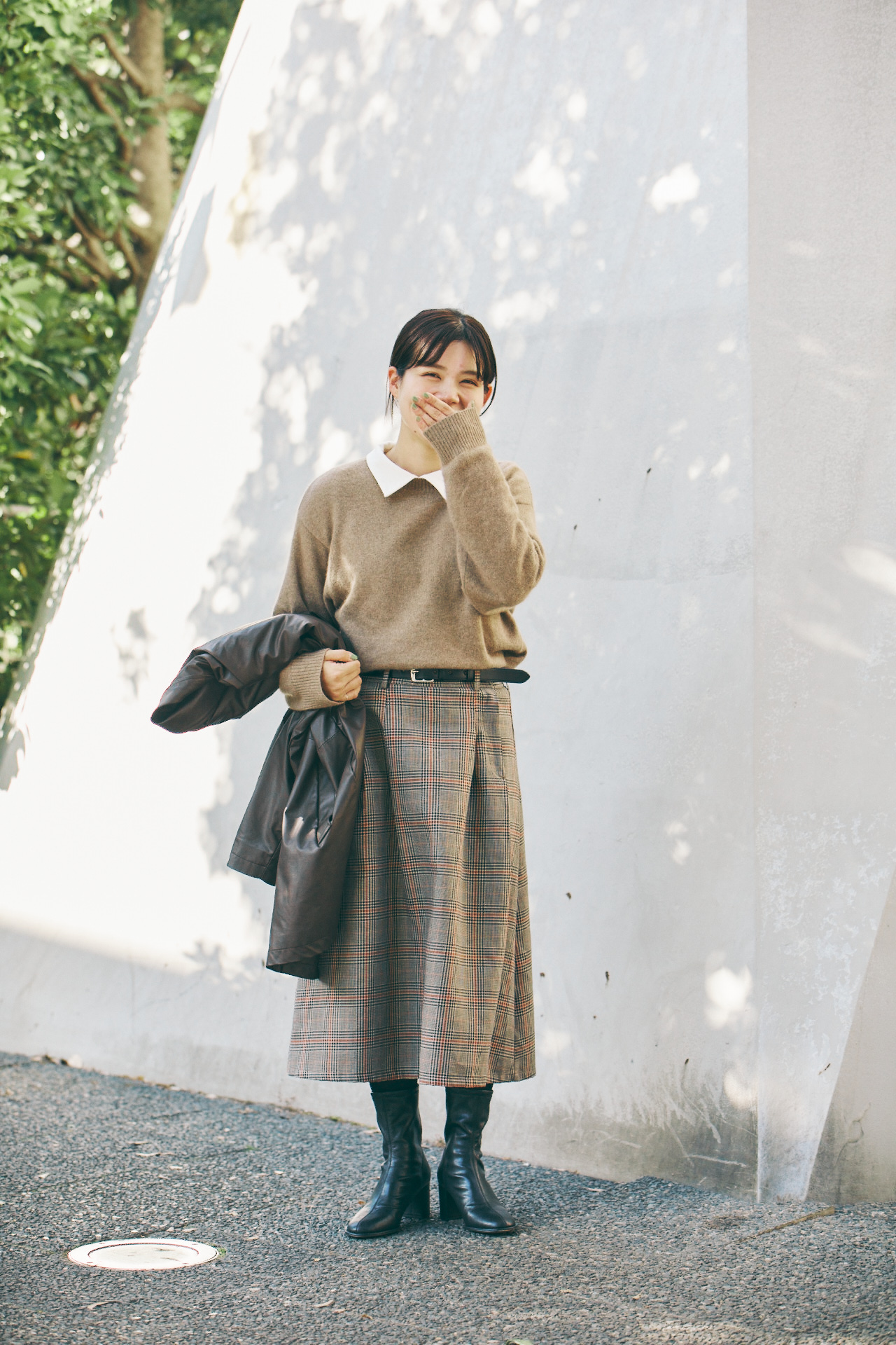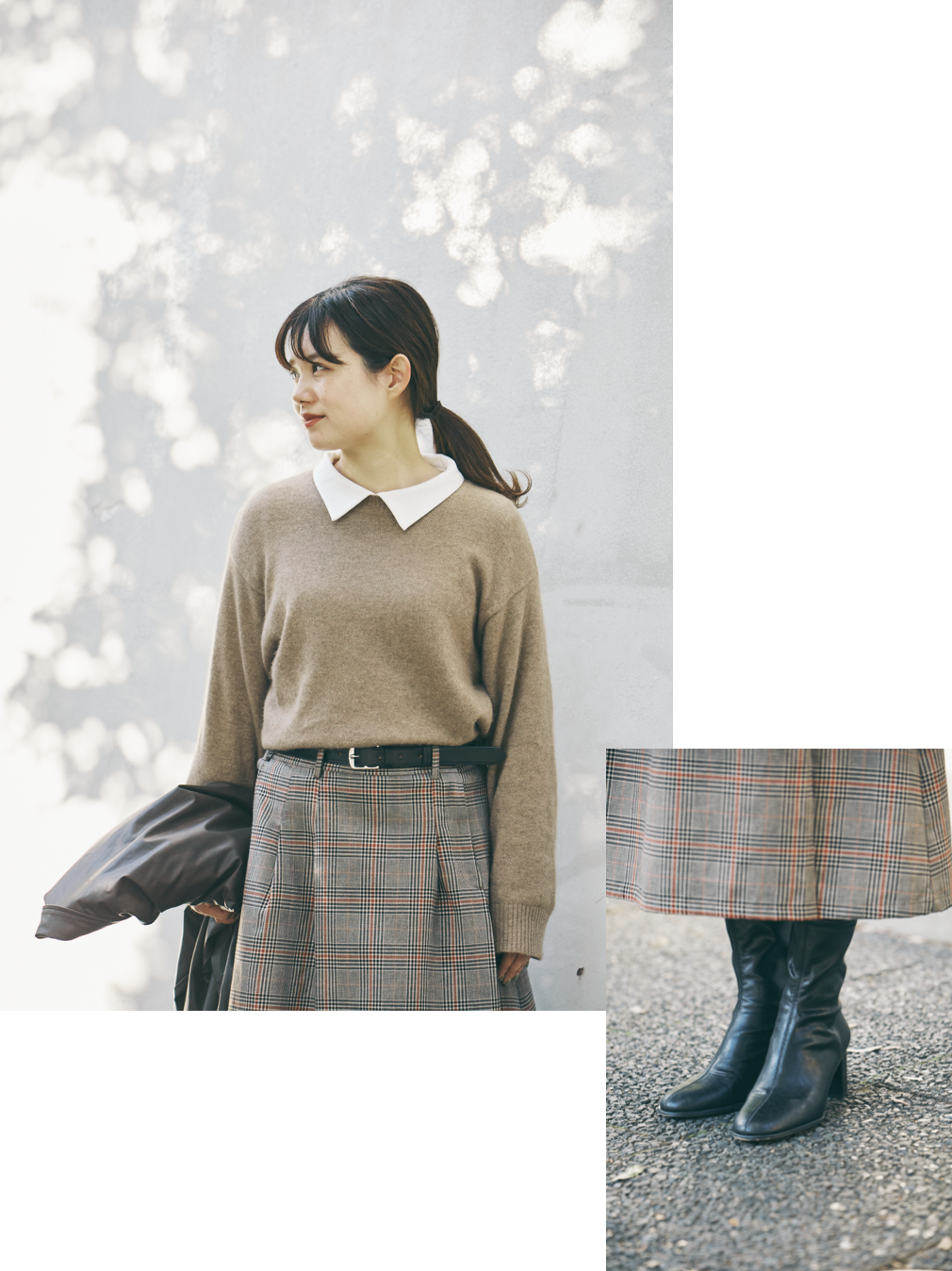 「スカートに合わせて、ニットもベージュをセレクトしました。ただ、ベージュだけだと全体がまったりしてしまうので、黒のレザーブーツやベルトで引き締めています。首もとからは白い衿を覗かせて、抜け感作りを意識しました。ラクーンニットはFUDGE Weekendでも販売していたおすすめアイテムです」。