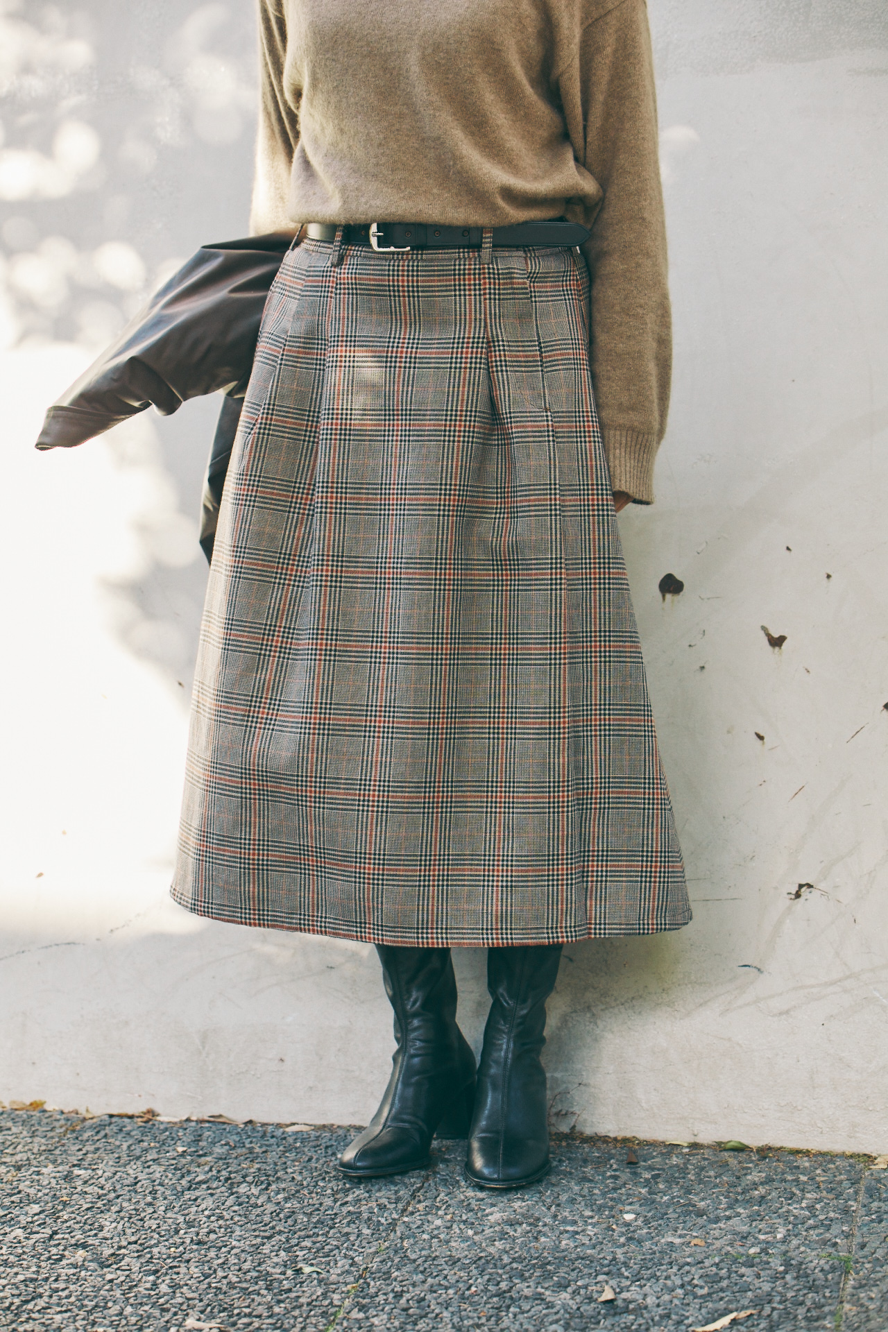ブリティッシュなチェック柄の端正な印象を最大限に生かしたコーディネート。組み合わせはシンプルながら、ふわりと風をはらむスカートの裾やチェック柄が着こなしの魅力を高めている。