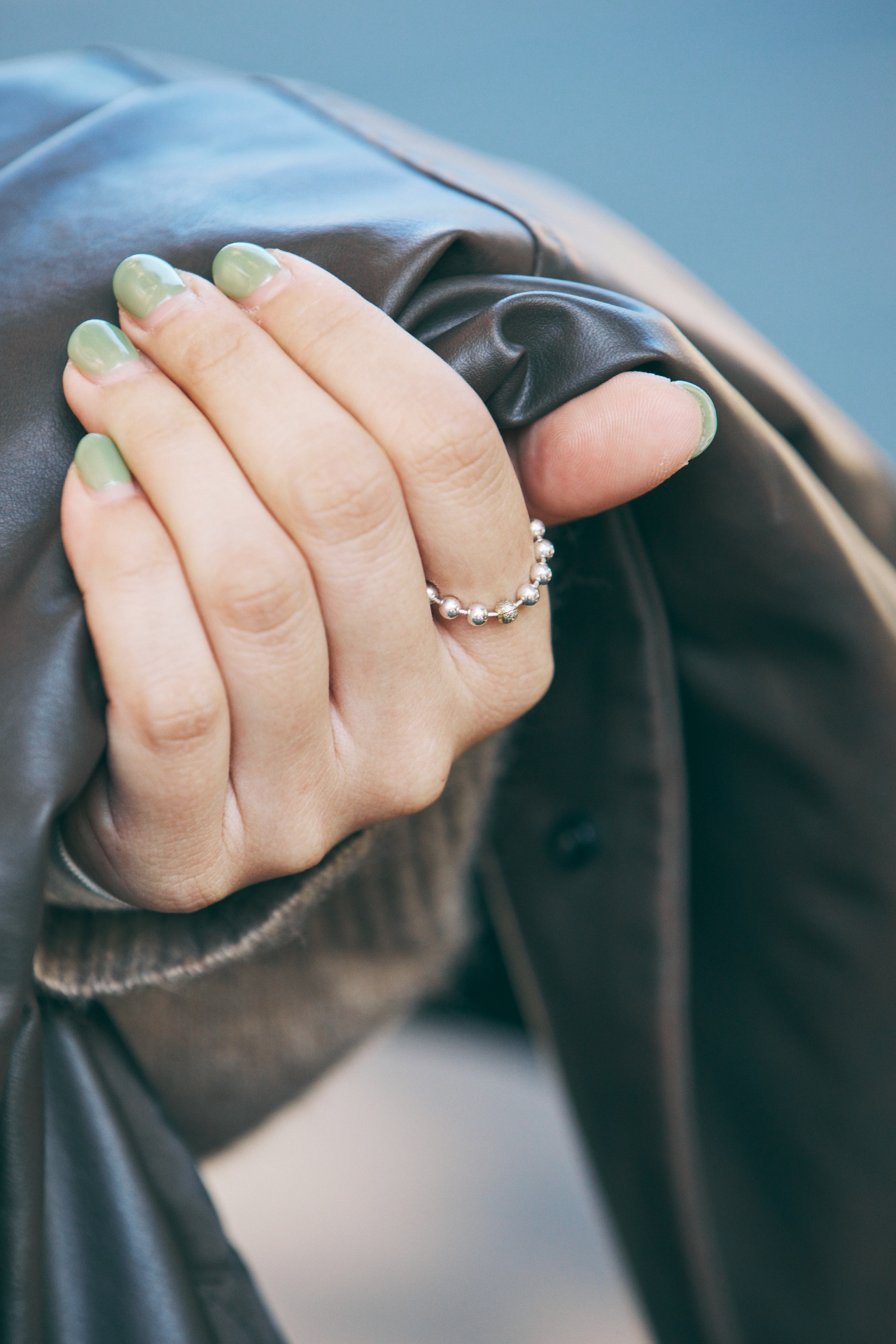 全体はベーシックカラーでまとめつつ、グリーンのネイルやシルバーリングのさり気ない遊び心が光る。