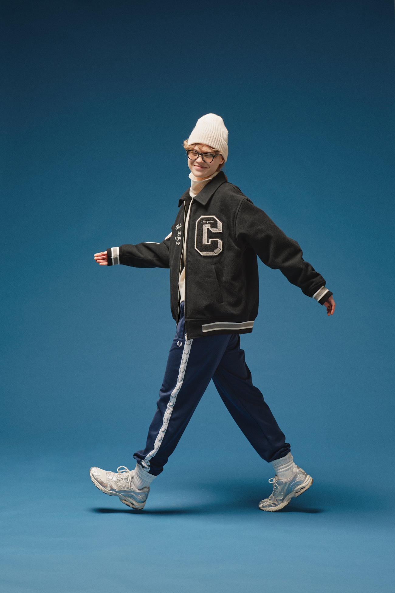 ジャケット¥30800 / Champion(ヘインズブランズ ジャパン カスタマーセンター)、タートルネックカットソー¥19800 / Nigel Cabourn WOMAN(アウターリミッツ)、パンツ¥17600 / FRED PERRY(フレッドペリーショップ東京)、ニット帽¥10780 / GREEN THOMAS(マッハ55リミテッド)、ソックス¥1210 / 靴下屋(タビオ)、スニーカー¥16500 / Mizuno(ミズノお客様相談センター)