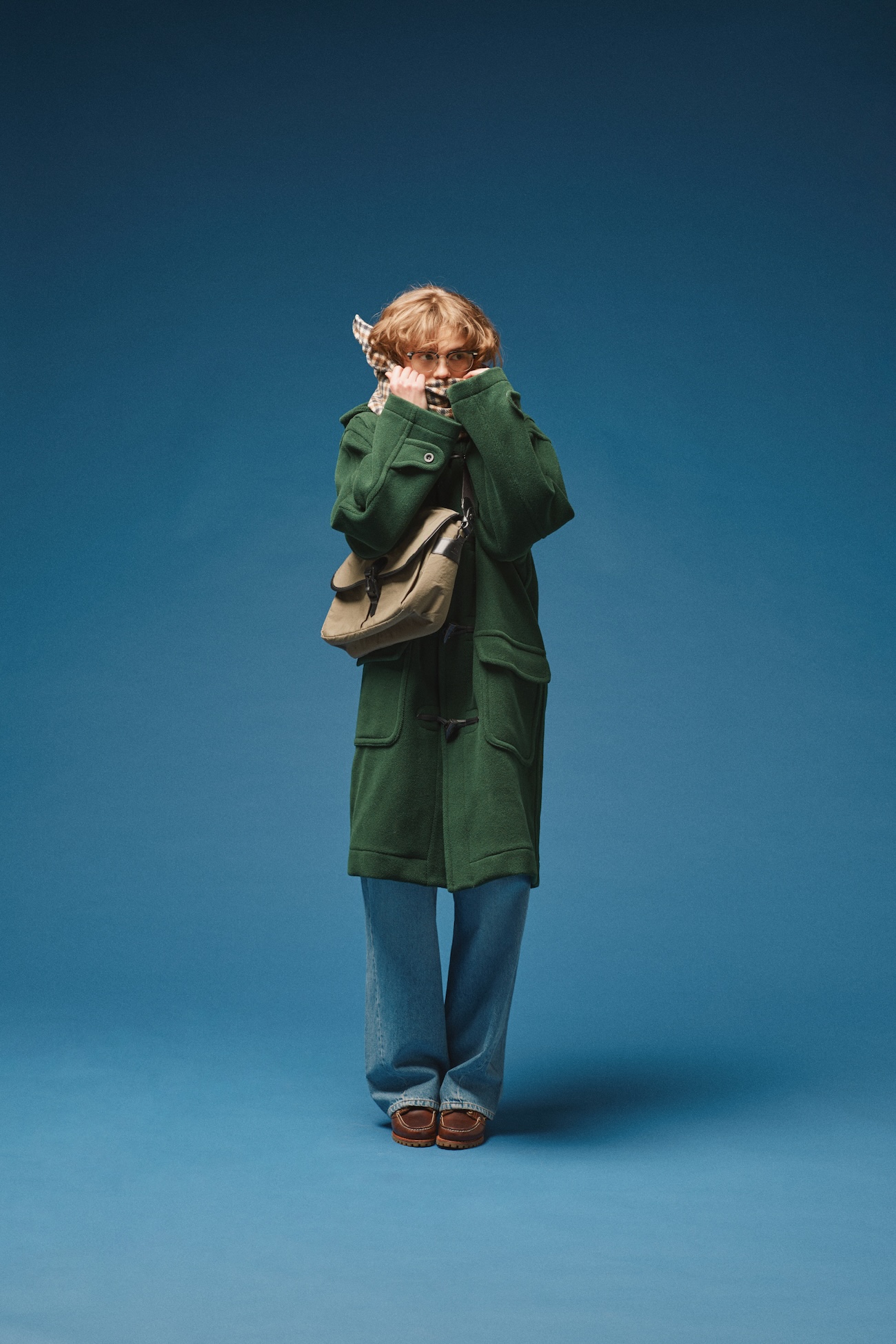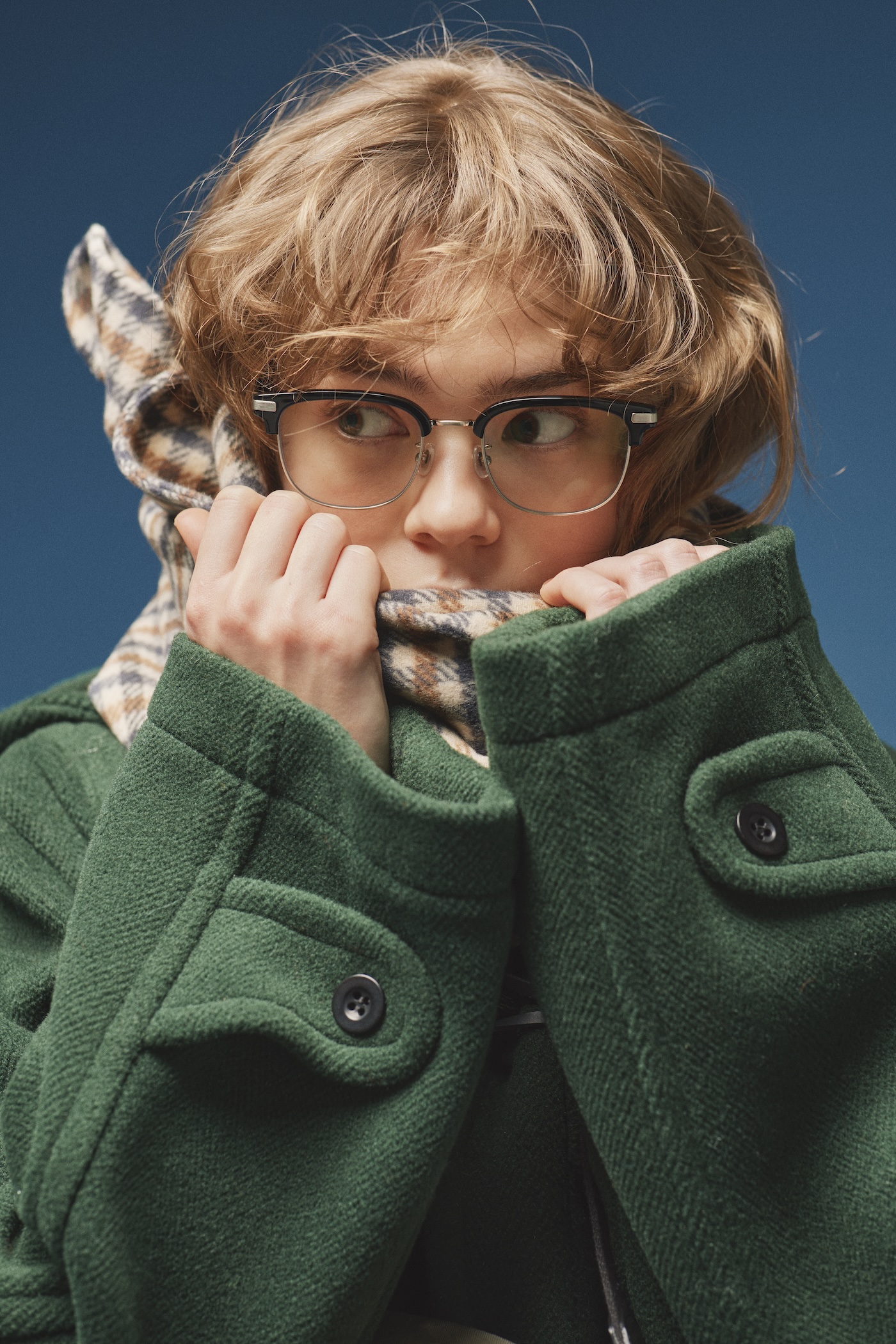 「ブロウ」の黒縁メガネをボーイに着るなら、アイビースタイルがうってつけ。眉のような存在感のある上部リムが、コーディネート全体に程よい重心を生み、ボーイッシュな着こなしにメリハリを与えてくれる。深みのあるグリーンのダッフルコートに、太めのデニム。首元にはチェック柄のマフラーをくるりと巻いて、クラシックなムードをプラス。マフラーに顔をうずめた仕草さえ絵になるのは、このメガネのおかげだね。合わせたのは、《Zoff(ゾフ)》のブロウフレーム。フレーム端の大きめなメタルパーツが、アイビールックのナイスアクセント!