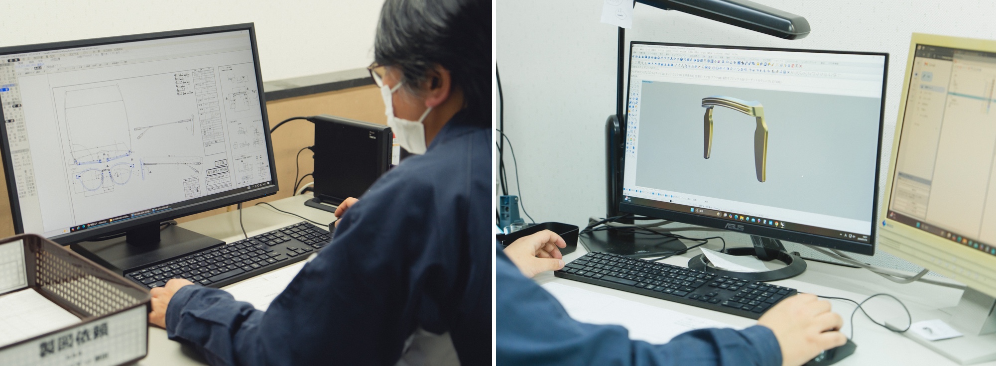 製造するための最初の指示書となる、図面(左)と立体データ(右)を製作している様子。