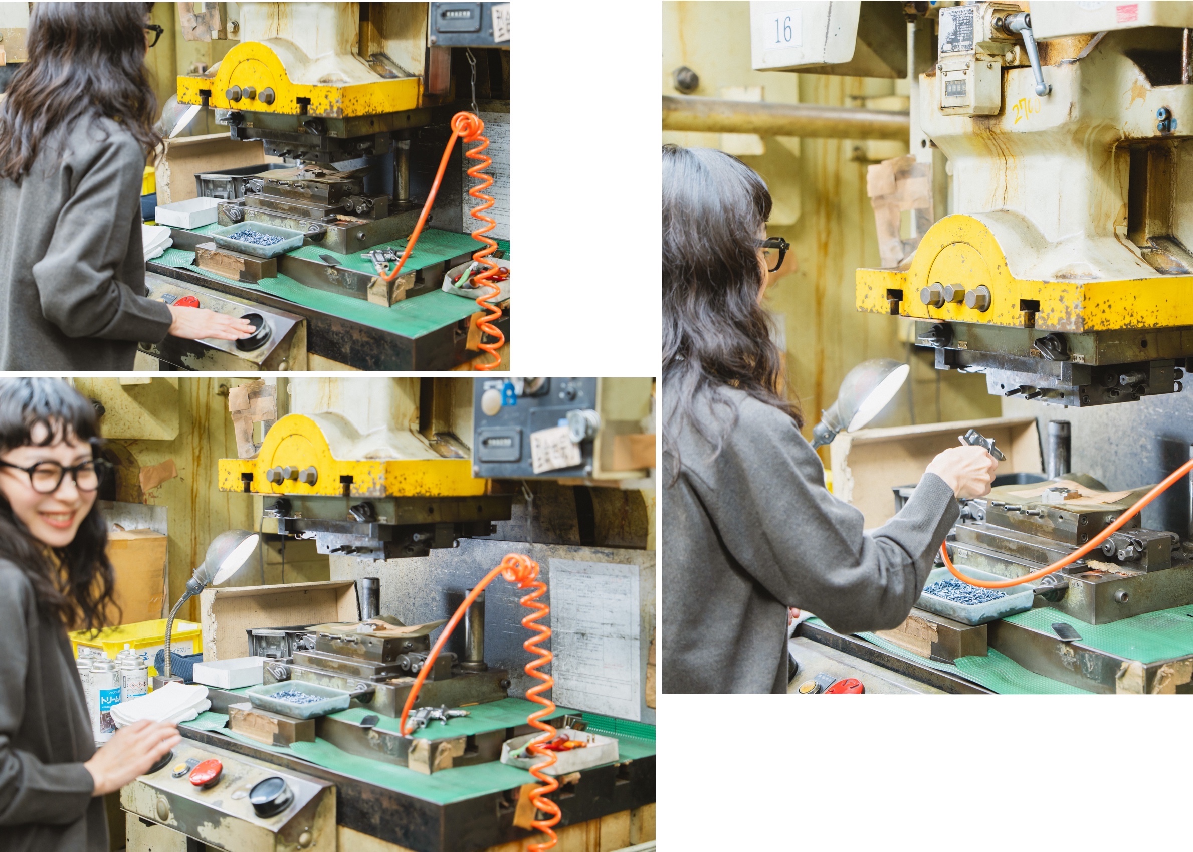 ボタンを押すと、数百tの力が一気に加わり、驚く田中さん。プレス後は空気の入ったスプレーで部品を配置する金型をきれいにする。