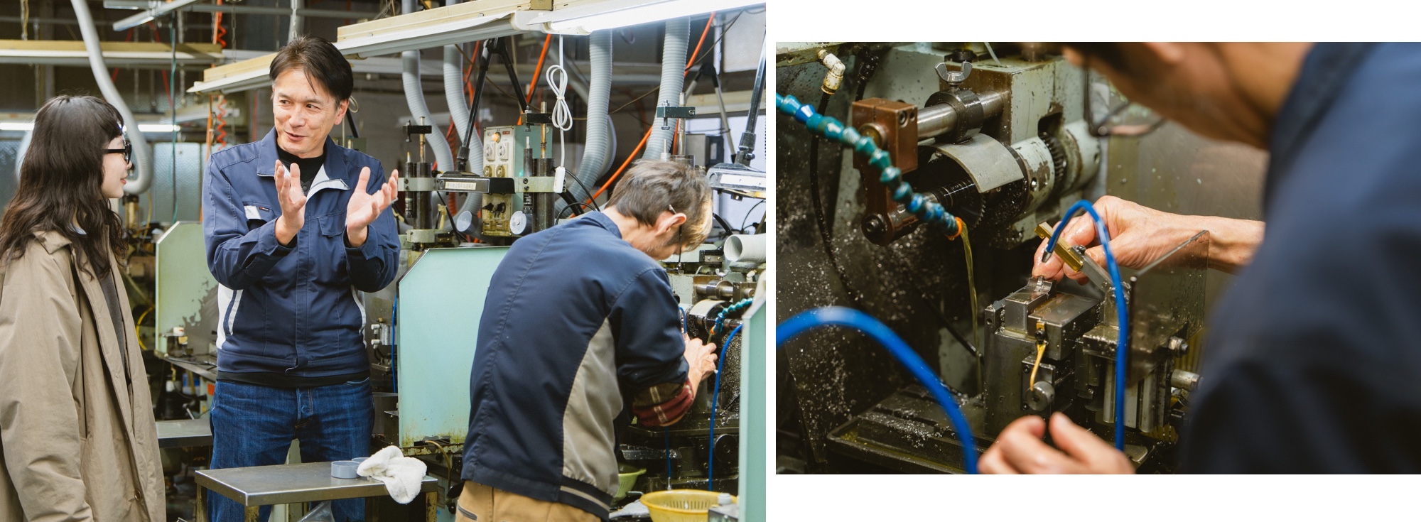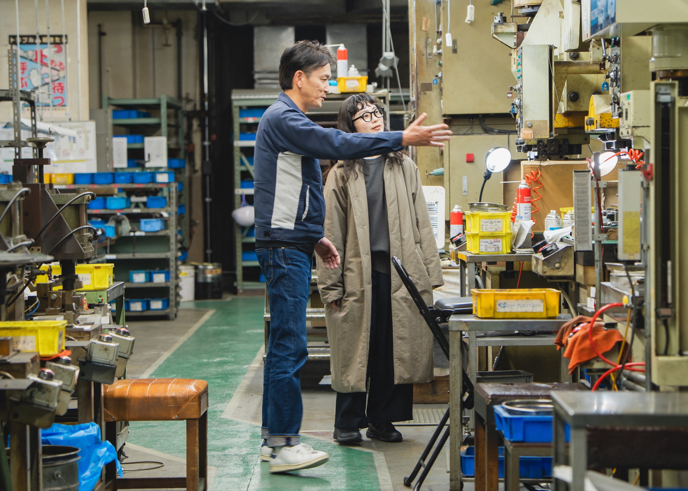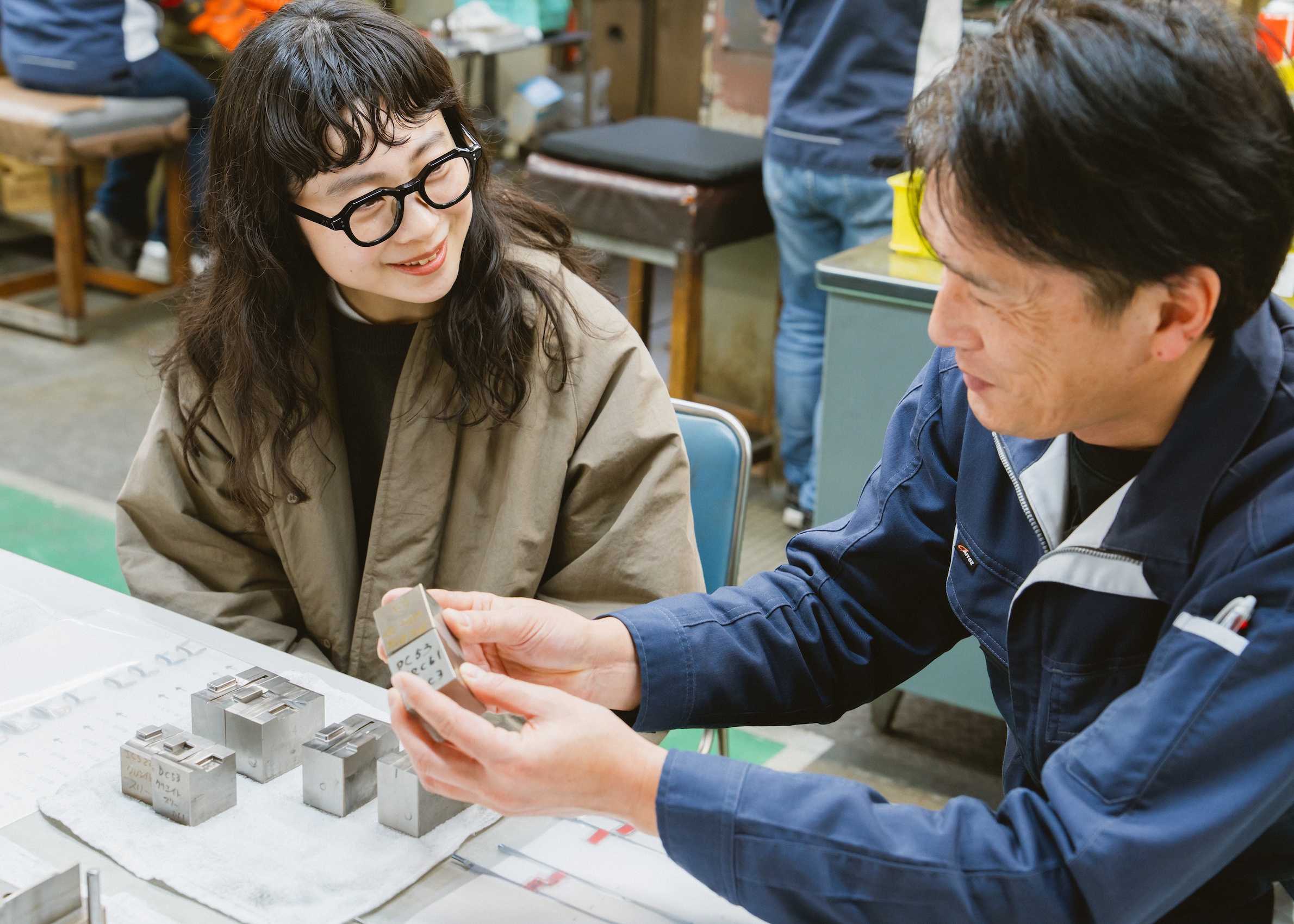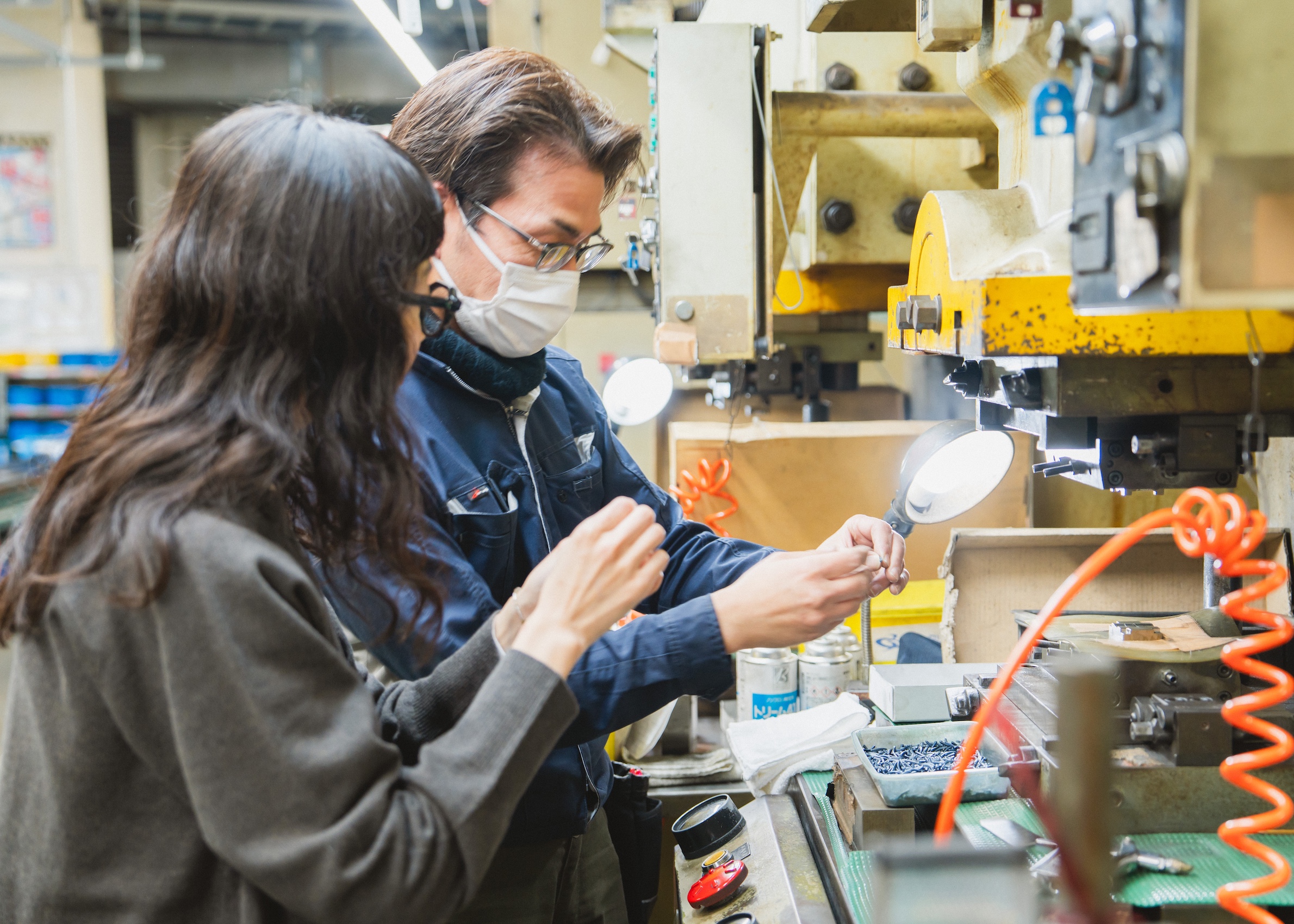 職人の方にどのパーツをプレス加工しているか教えてもらう田中さん。