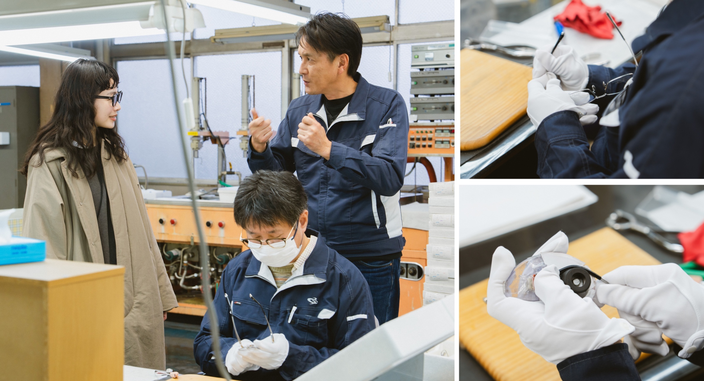 「この工具を使って組み立てるんです」と丁寧に教えてくれる職人さん。「こんな細かな作業ができてすごいです」と尊敬の眼差しで見る田中さん。 右下:組み立てたメガネに細かなキズがないかなど、確認している様子。