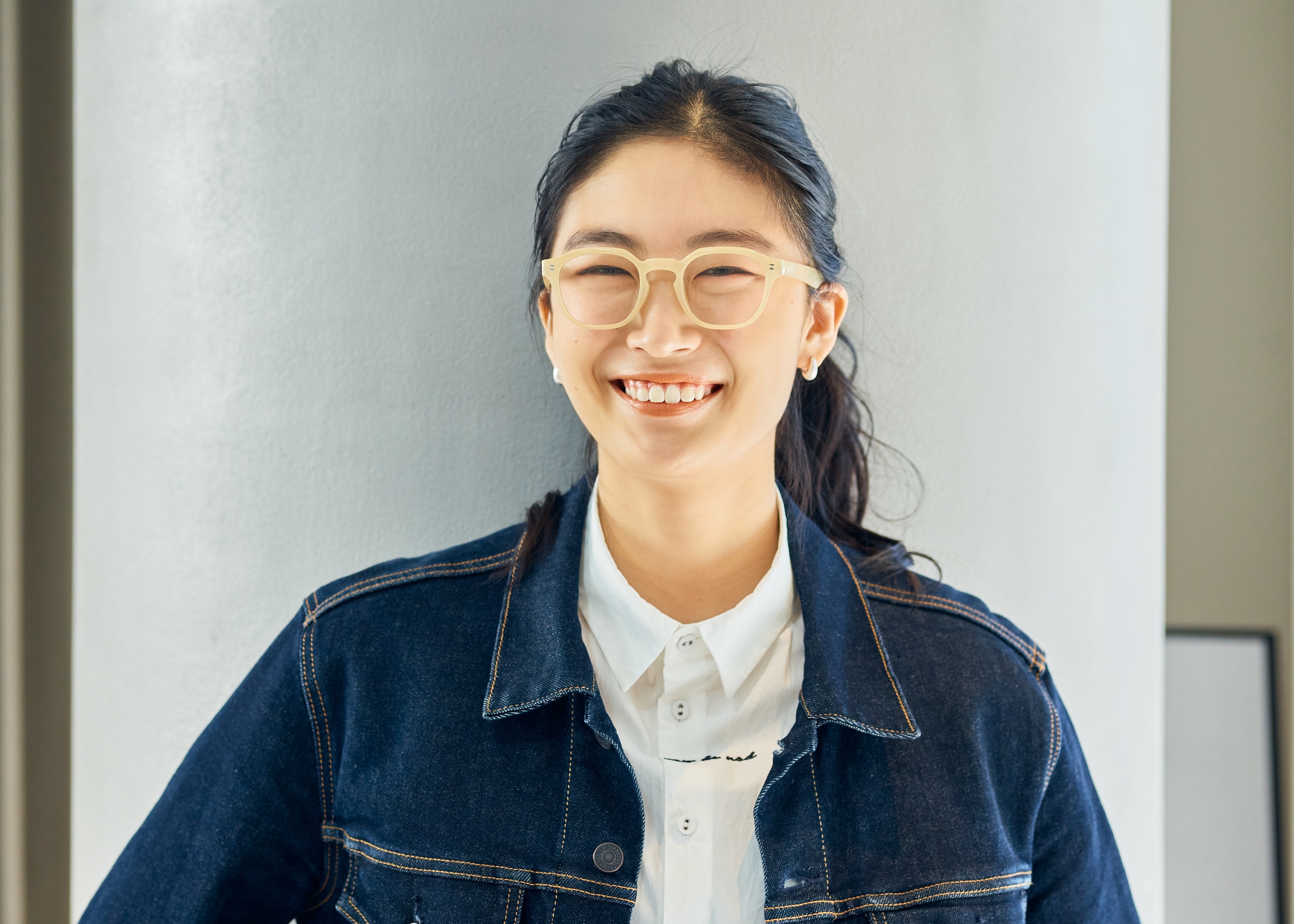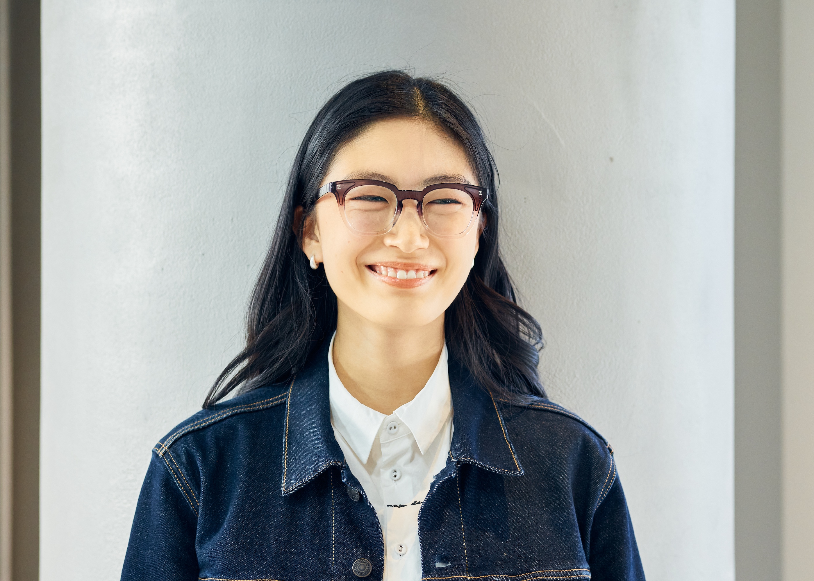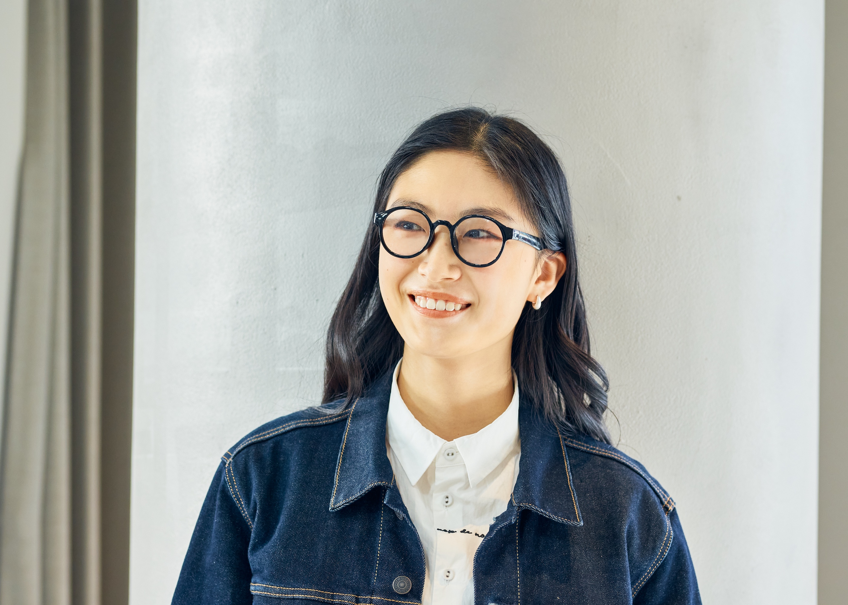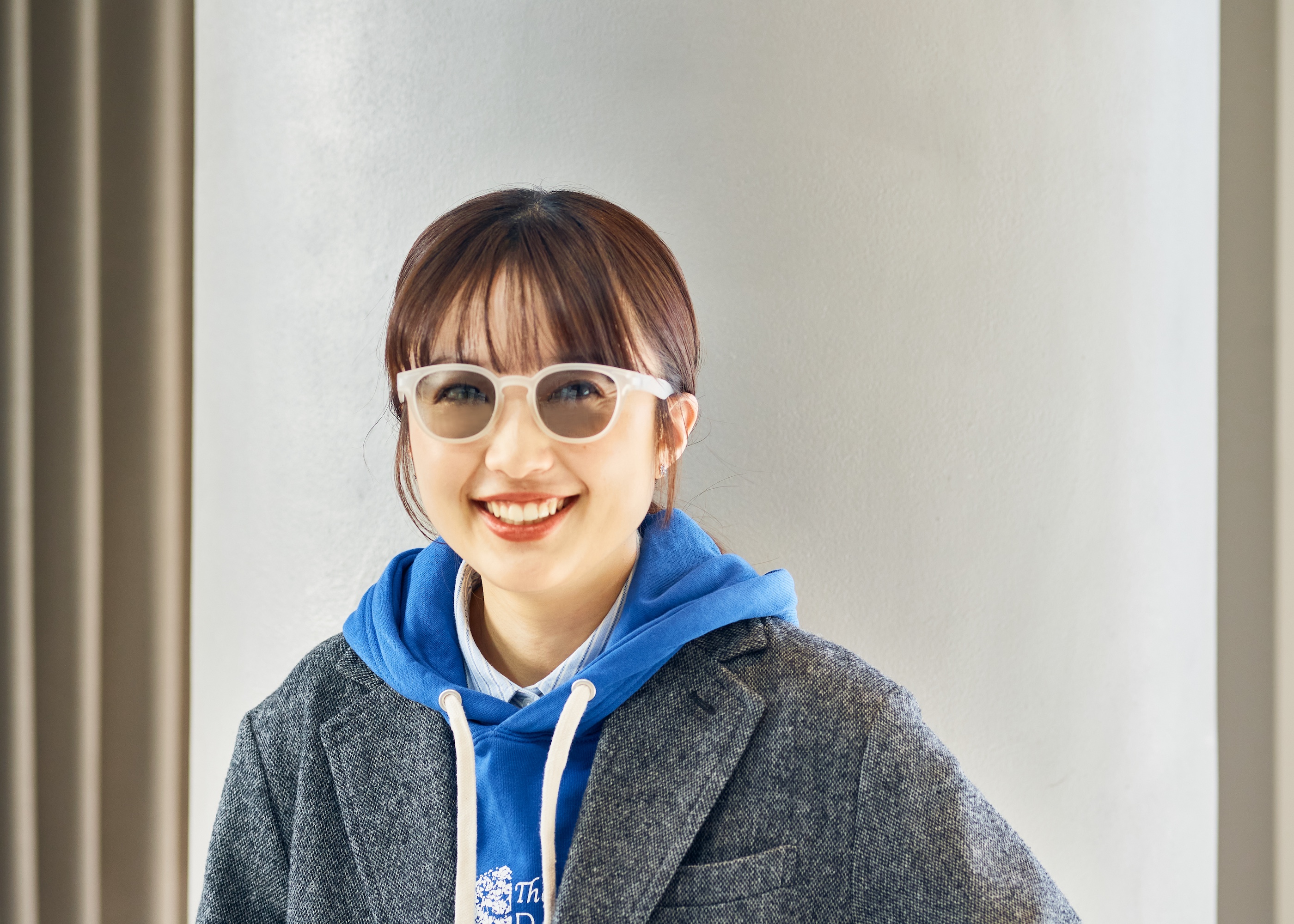 | A:フォックスラインにフレームが大きめを選ぶと良いです。レンズと目の間に余白があるほど顔のパーツが寄って見えるので、あえて大きめのフレームにすることで女性らしい華奢な感じが強調されるようにしました。また黒から徐々にクリアになるフェードのかかったフレームにすることで、軽やかな見た目になるようにしました。 |
