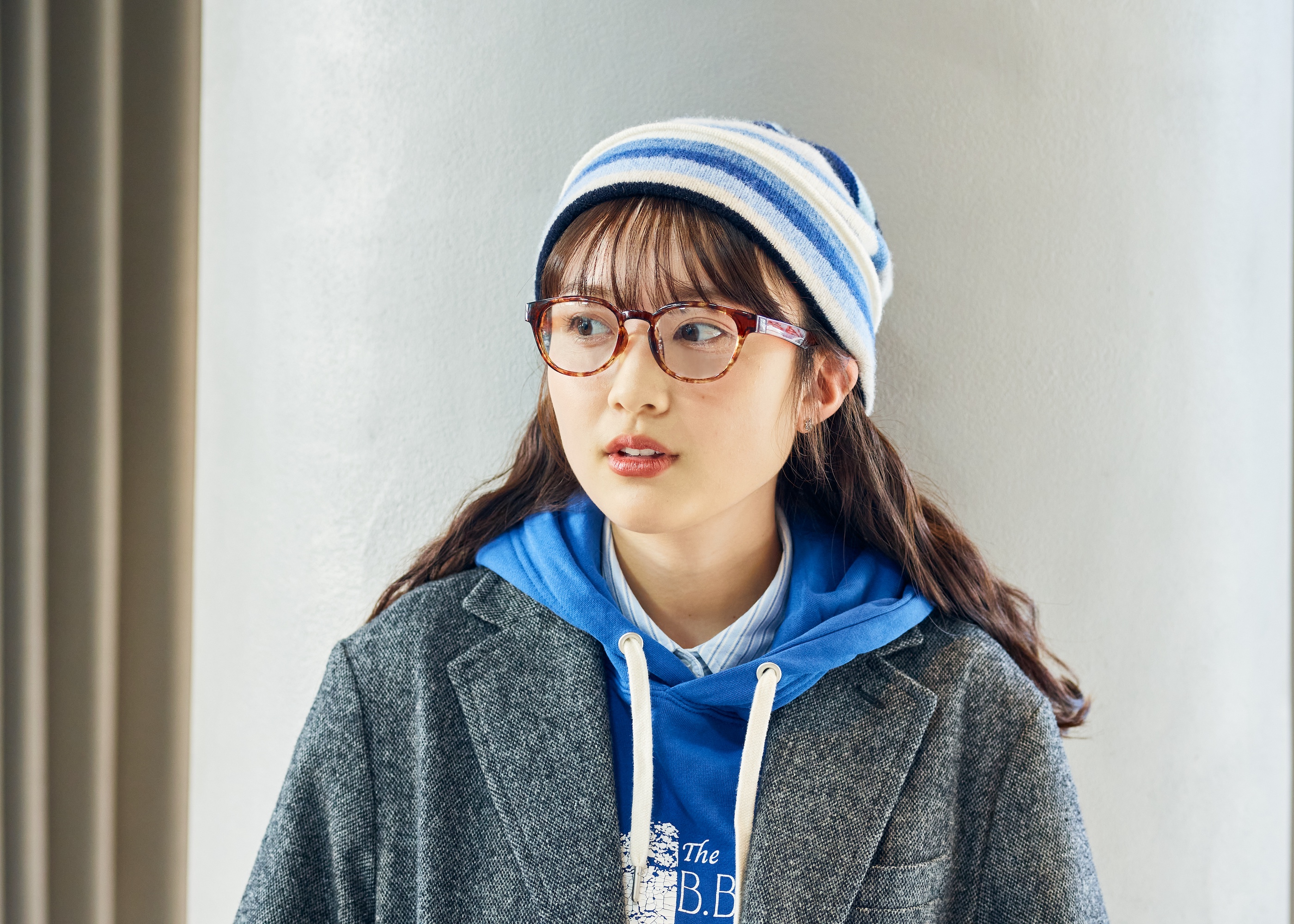 A:横幅が小さめタイプのウェリントンが似合います。顔のシルエットが丸い方には、直線的な四角でちょっとシャープにするとバランスが良くなるんです。またフレームをブラウン系のべっ甲柄にすることで、顔周りを明るくしてくれたり、カジュアルなスタイルにも合わせやすくしました。 |