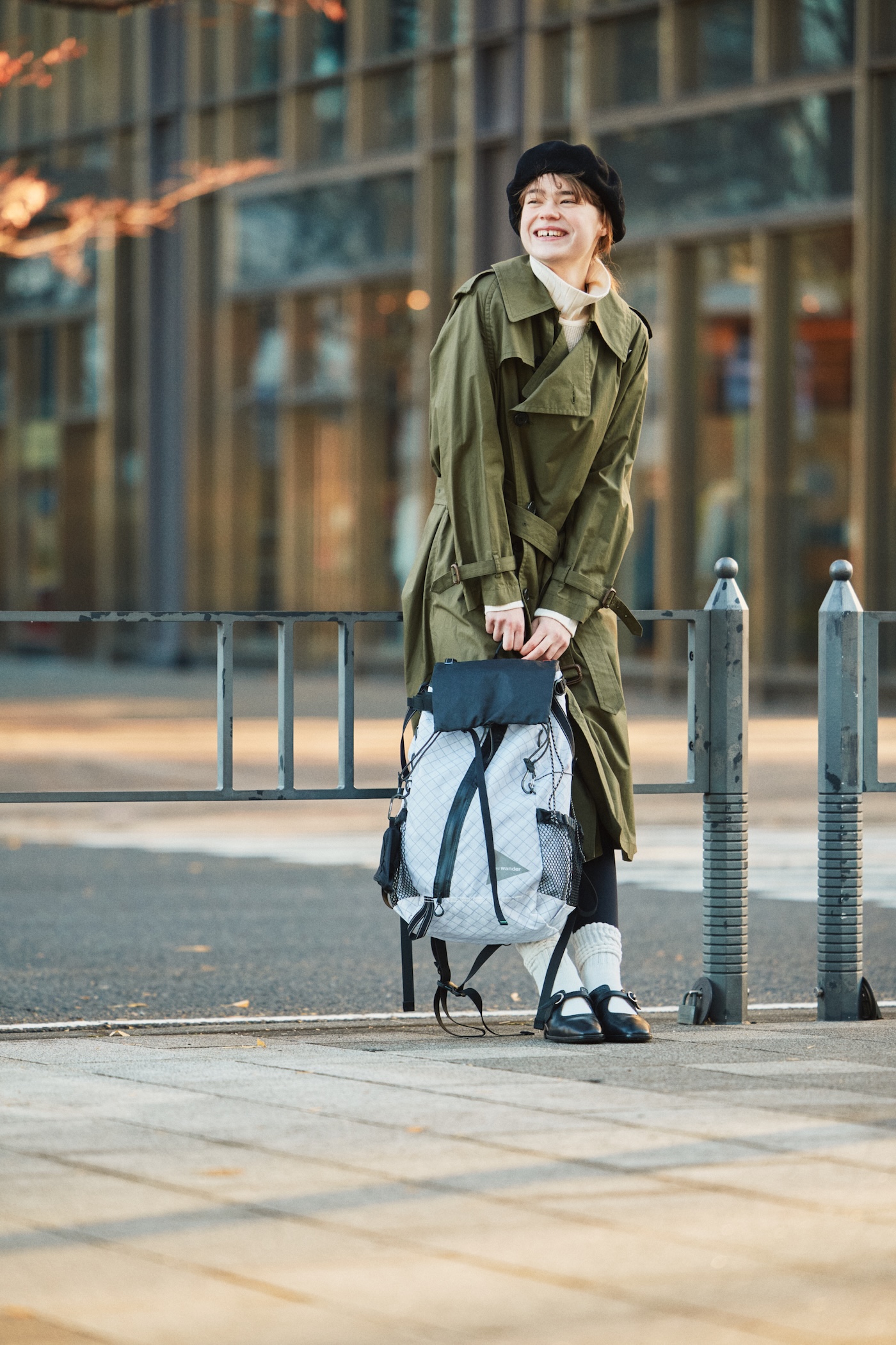 正統派なトレンチコートに、あえてテック感のあるバックパックを合わせる。《and wander(アンドワンダー)》のバックパックは、軽やかな素材感とシャープなデザインが魅力。クラシックな装いに取り入れても浮かず、スタイリングをぐっと今のムードへと引き寄せてくれる。きちんと感をベースに、異なるテイストを重ねることで、洗練された抜けのある着こなしに。