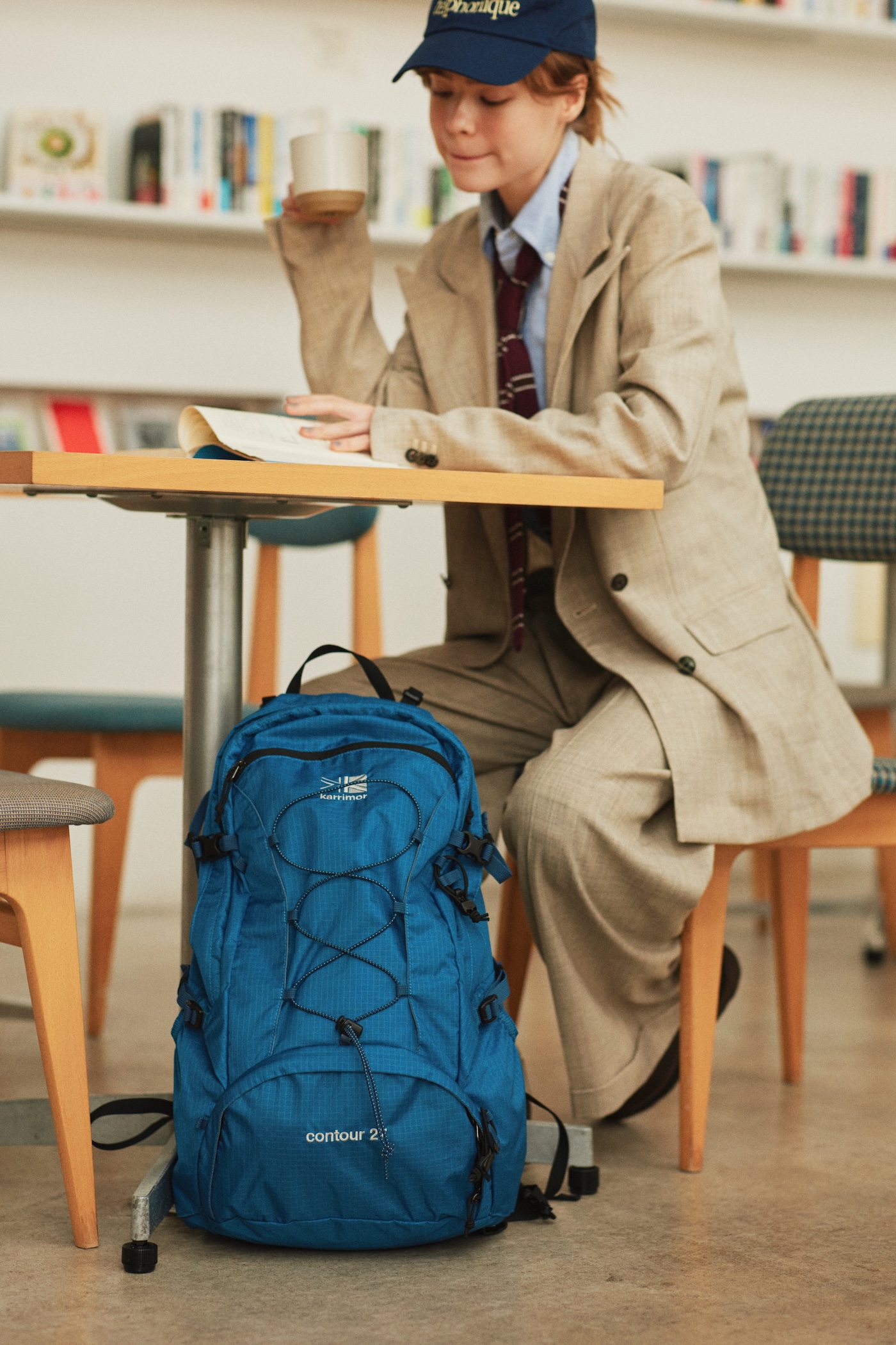 きちんとした装いにアウトドア由来のアイテムを添えることで、堅さがほどよくほぐれ、軽やかなムードが生まれるのです。鮮やかなブルーはアクセントになりながらも、知的な雰囲気を崩さない絶妙なカラー。